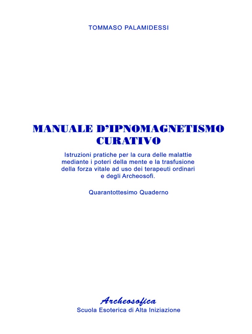 In questo Quaderno Tommaso Palamidessi presenta i principi e le tecniche dell’ipnomagnetismo curativo, una disciplina basata sull’uso della mente, della volontà e della trasfusione di forza vitale per favorire la guarigione. Il testo illustra esercizi di concentrazione, respirazione e tecniche magnetiche, inserendoli nella prospettiva della medicina archeosofica e della tradizione spirituale cristiana.