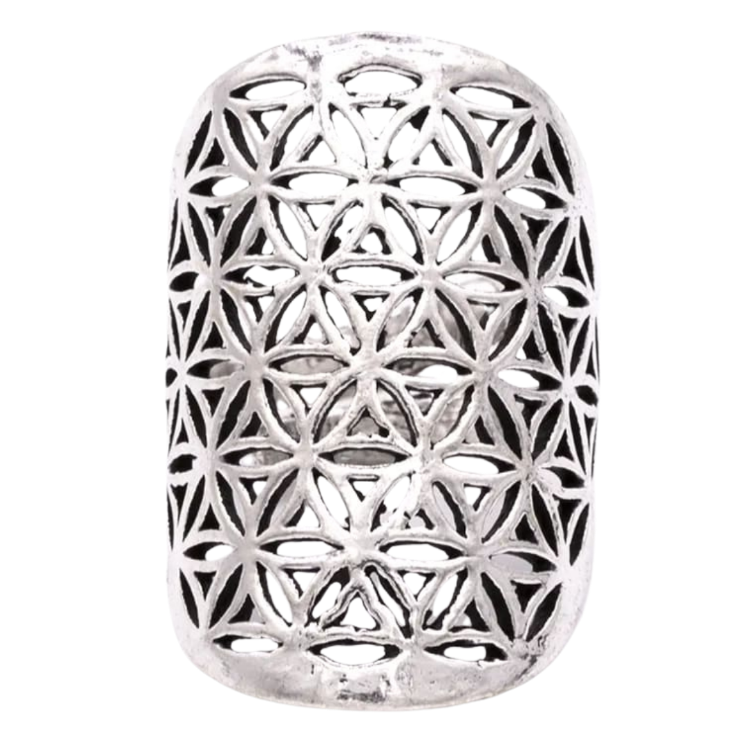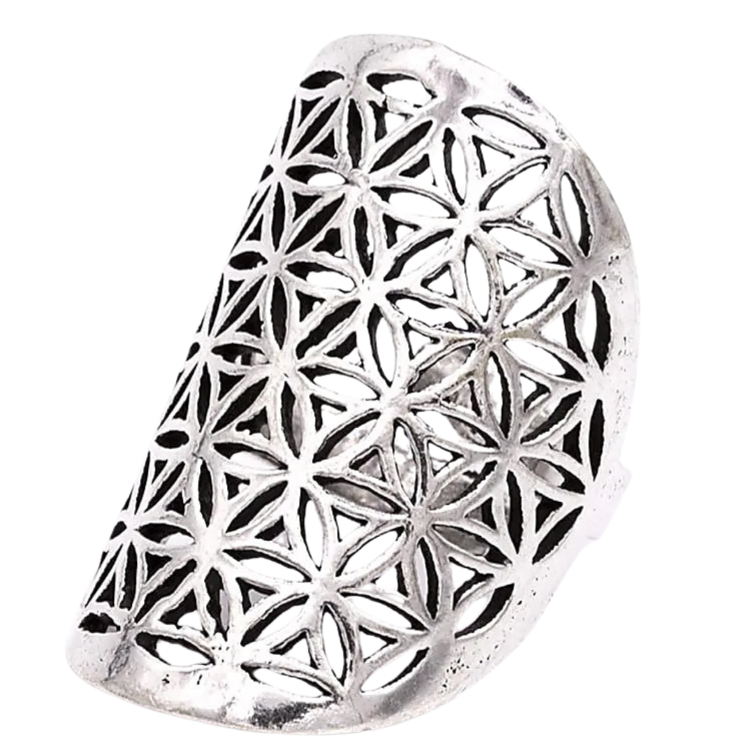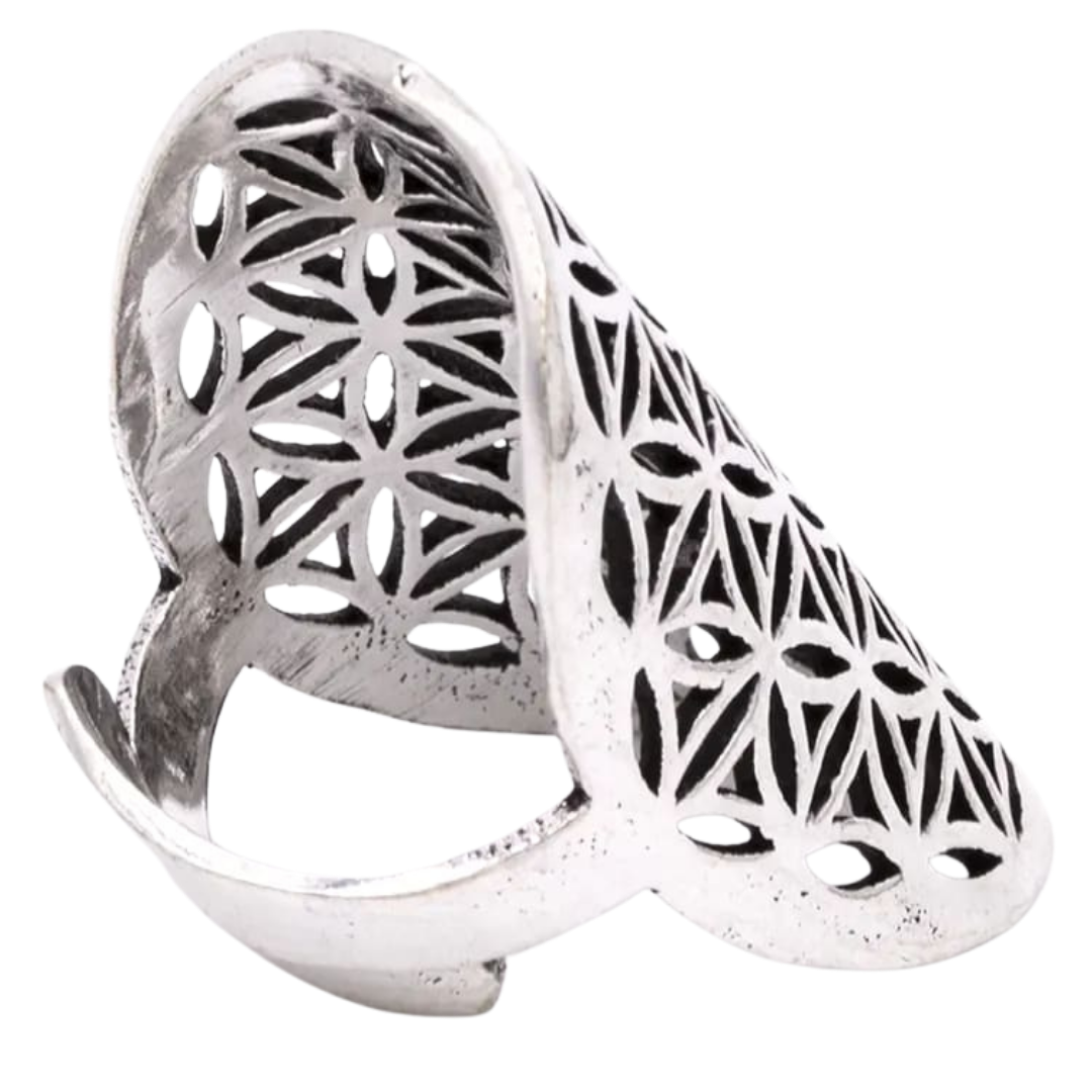 Anello regolabile placcato argento con incisione del Fiore della Vita, simbolo universale di armonia, creazione e ordine cosmico.
