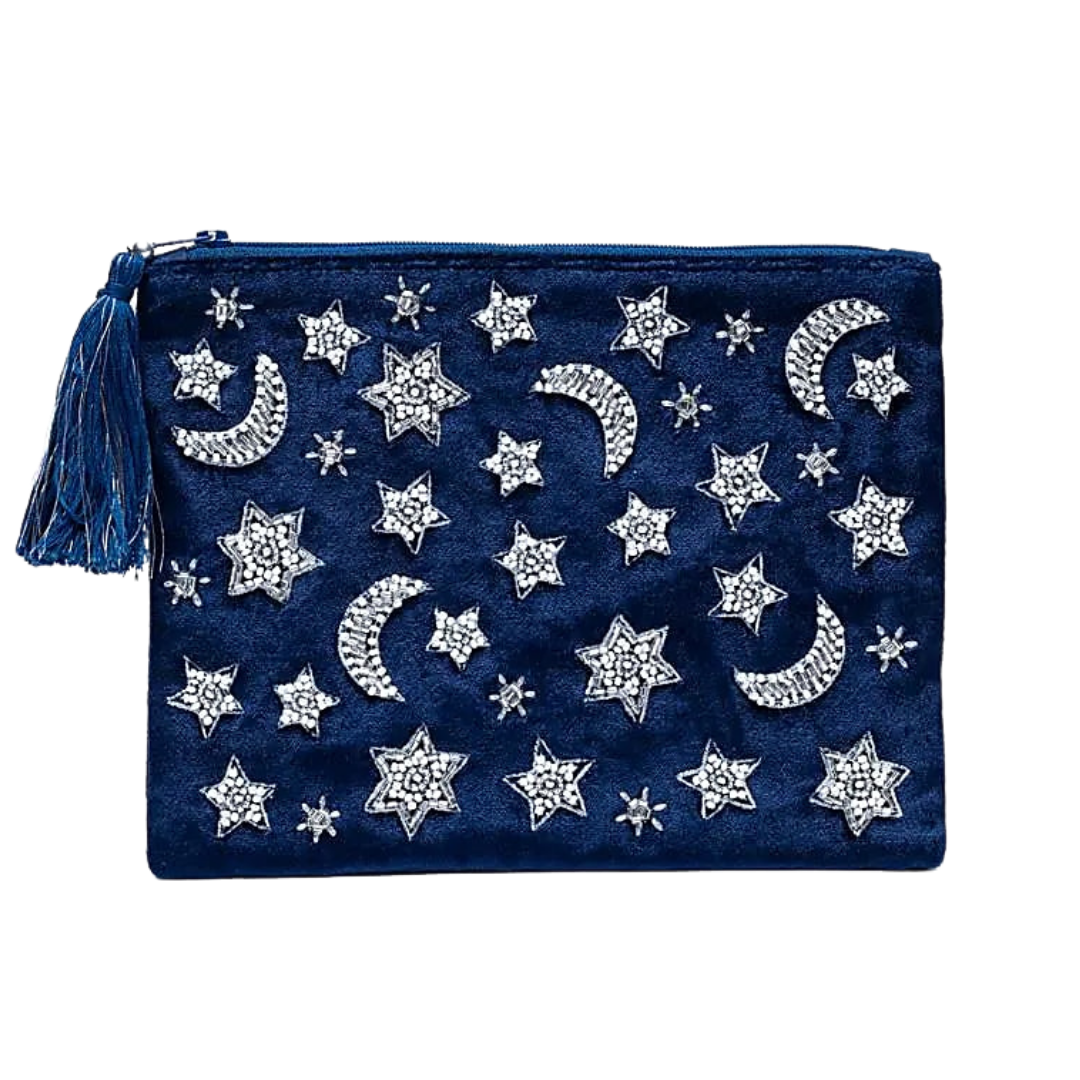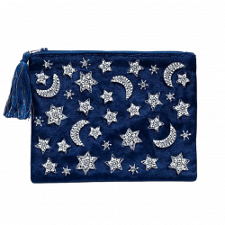 Astuccio in morbido velluto blu notte con ricami di lune crescenti e stelle luminose, pensato per custodire piccoli oggetti con un tocco decorativo ispirato al cielo notturno. Il motivo celeste trasforma un accessorio pratico in un dettaglio capace di evocare mistero, intuizione e quiete. Realizzato con cura artigianale e materiali di qualità.