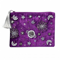 Astuccio in morbido velluto viola con ricami argentati raffiguranti pianeti, stelle e motivi cosmici e chiusura a cerniera con nappina, pensato per custodire piccoli oggetti con ordine e stile. Il tema della galassia richiama l’infinito e il mistero dell’universo, trasformando un accessorio quotidiano in un simbolo di esplorazione interiore e immaginazione. Realizzato con cura artigianale e materiali di qualità.