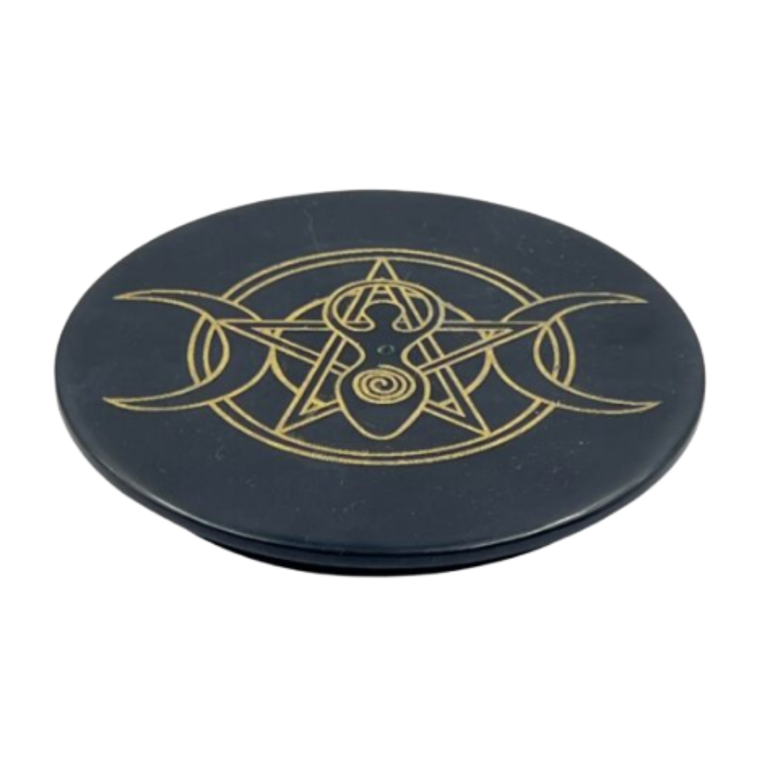 Brucia incenso dea e triplice luna in pietre saponaria nera tondo - 10 cm