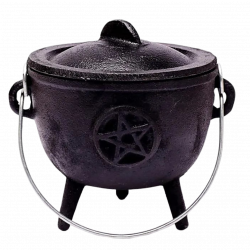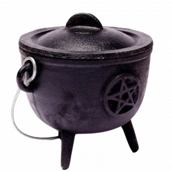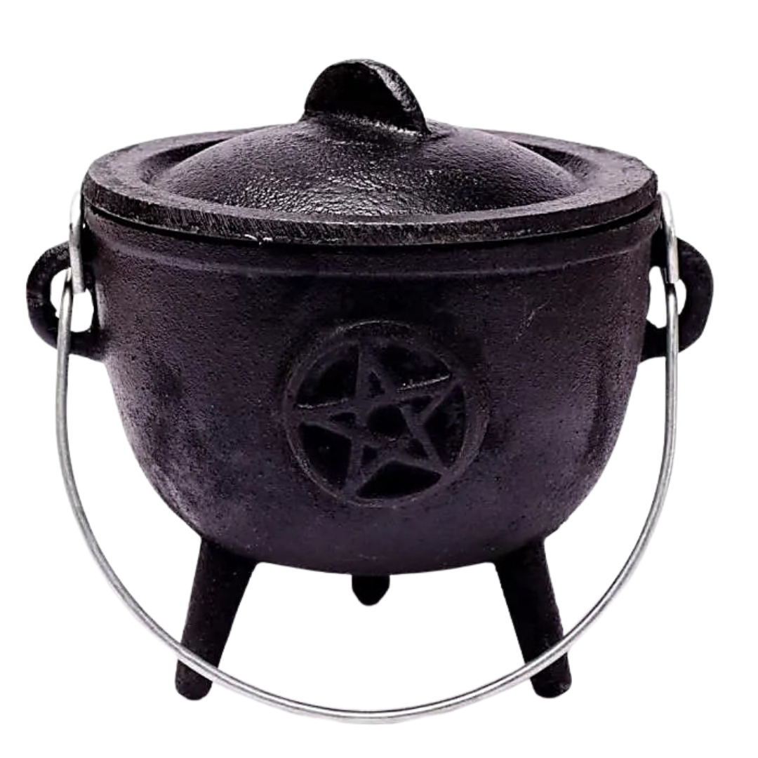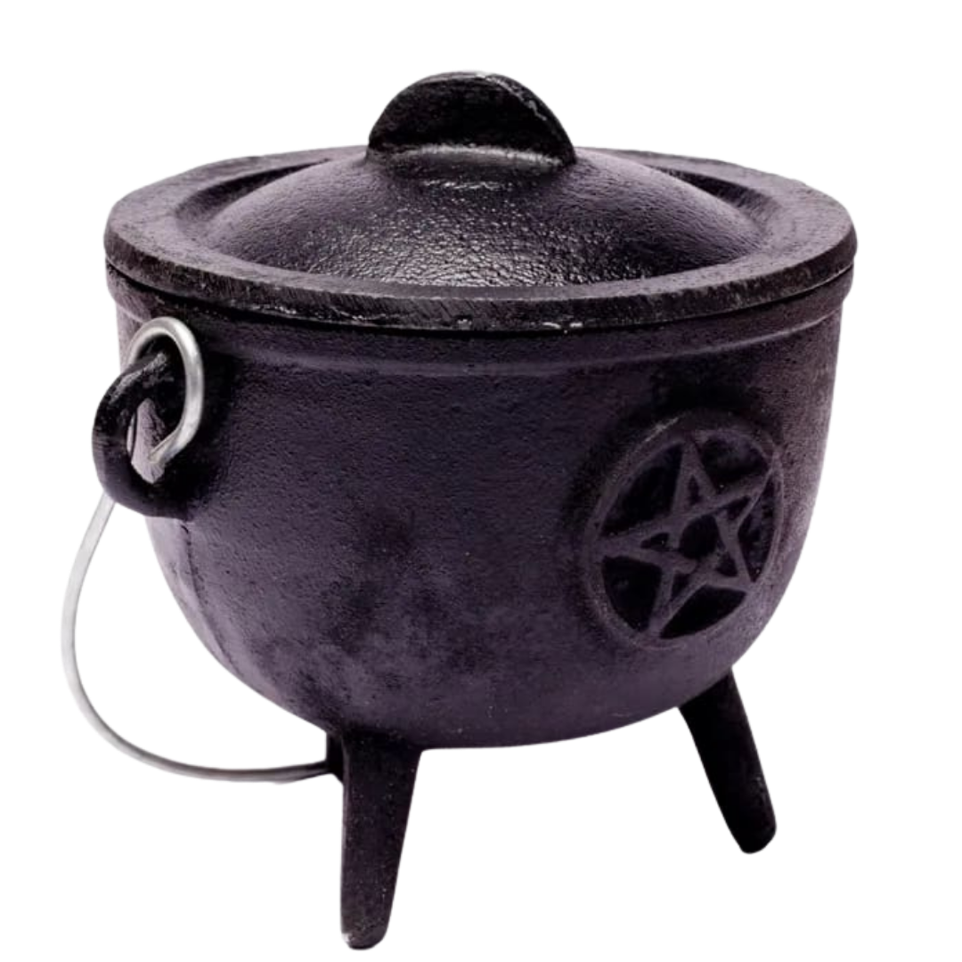 Calderone rituale in ghisa nera con simbolo pentacolo in rilievo. Utilizzato tradizionalmente nelle pratiche magiche come contenitore sacro per la combustione dell’incenso e dei carboncini, rappresenta uno strumento essenziale per rituali di trasformazione, protezione e consacrazione. Realizzato con materiali resistenti e adatti all’uso rituale.
