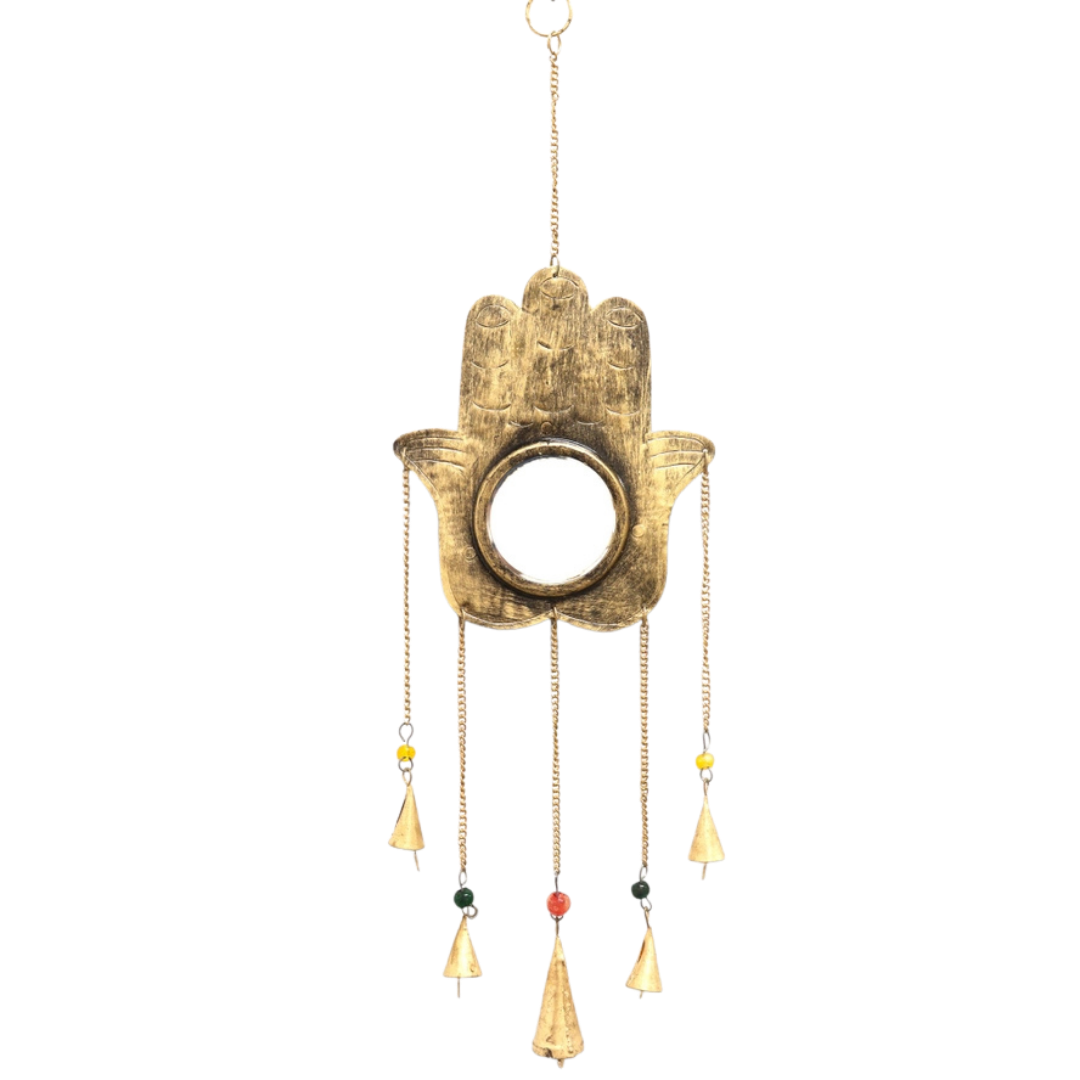 Campanelli a vento artigianali con Mano di Fatima (Hamsa) in formato grande, realizzati in ottone e impreziositi da specchio centrale e cinque campanelle pendenti, pensati come oggetto decorativo e simbolico per armonizzare e proteggere gli spazi. La forma iconica della mano, unita al suono delicato dei campanelli, rende questo elemento un vero guardiano energetico da appendere.