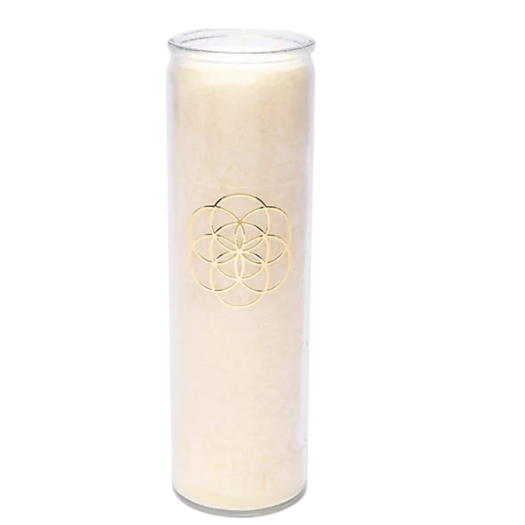 Candela yogi e yogini 100 h bianca e seme della vita in stearina in vetro