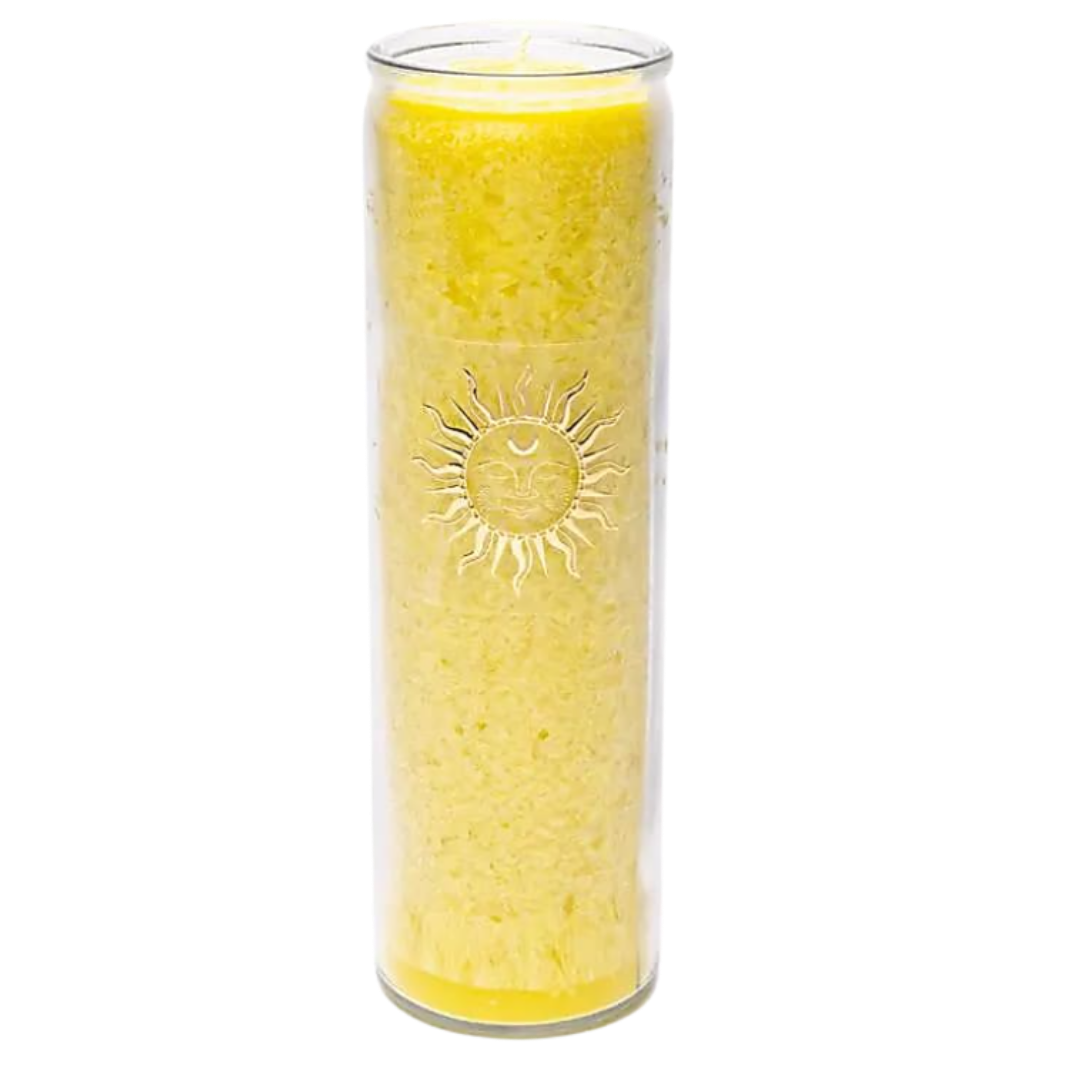 Candela yogi e yogini 100 h gialla e sole in stearina in vetro