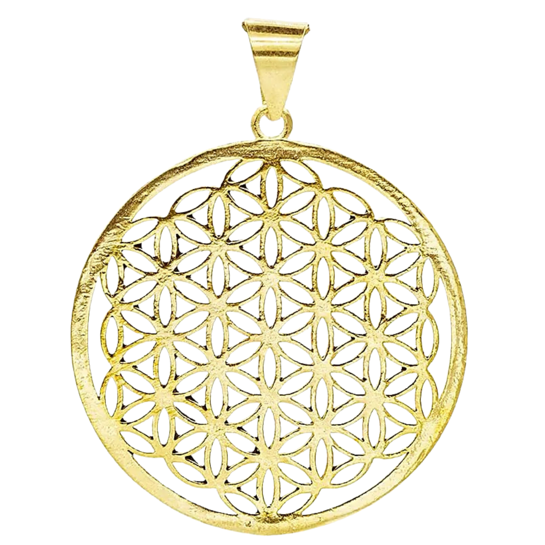 Ciondolo con simbolo del Fiore della Vita, realizzato in ottone dorato e finemente traforato. Emblema universale di armonia e ordine cosmico, è pensato come talismano di equilibrio, protezione e connessione con le leggi profonde della creazione. Realizzato con cura artigianale e materiali di qualità.
