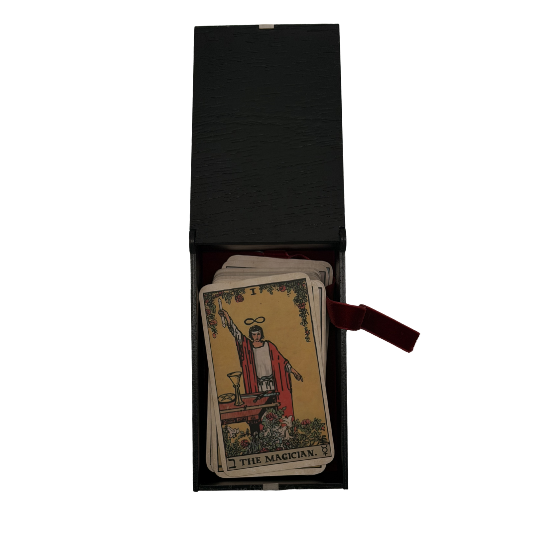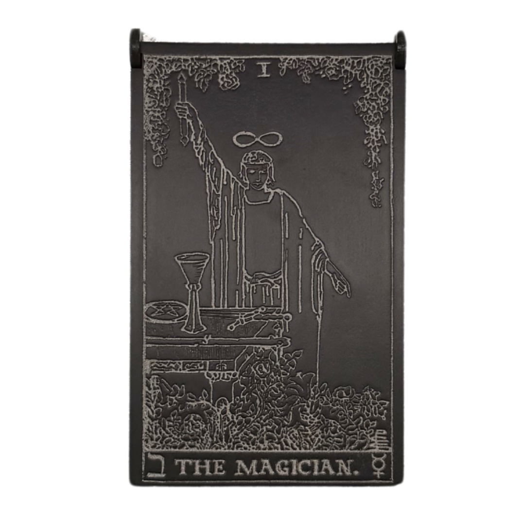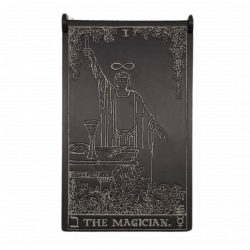 Simbologia: l’Arcano I, il Mago, è la figura dell’iniziatore e del mediatore tra cielo e terra, presente già nei mazzi rinascimentali come simbolo di ingegno, abilità e potere creativo. Nella tradizione esoterica rappresenta colui che sa canalizzare le energie universali attraverso la volontà consapevole, trasformando l’idea in azione e il potenziale in realtà. Gli strumenti sul suo tavolo — associati ai quattro elementi — indicano la padronanza delle forze della natura e della materia. Inciso su un cofanetto, il Mago diventa custode del sapere divinatorio e simbolo di concentrazione, lucidità mentale e capacità di dirigere il proprio destino, qualità fondamentali per chi pratica la lettura dei tarocchi.