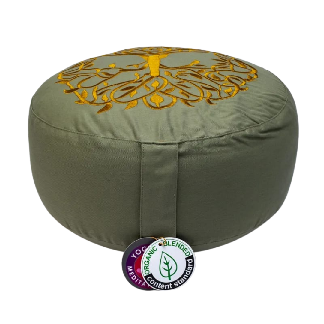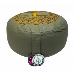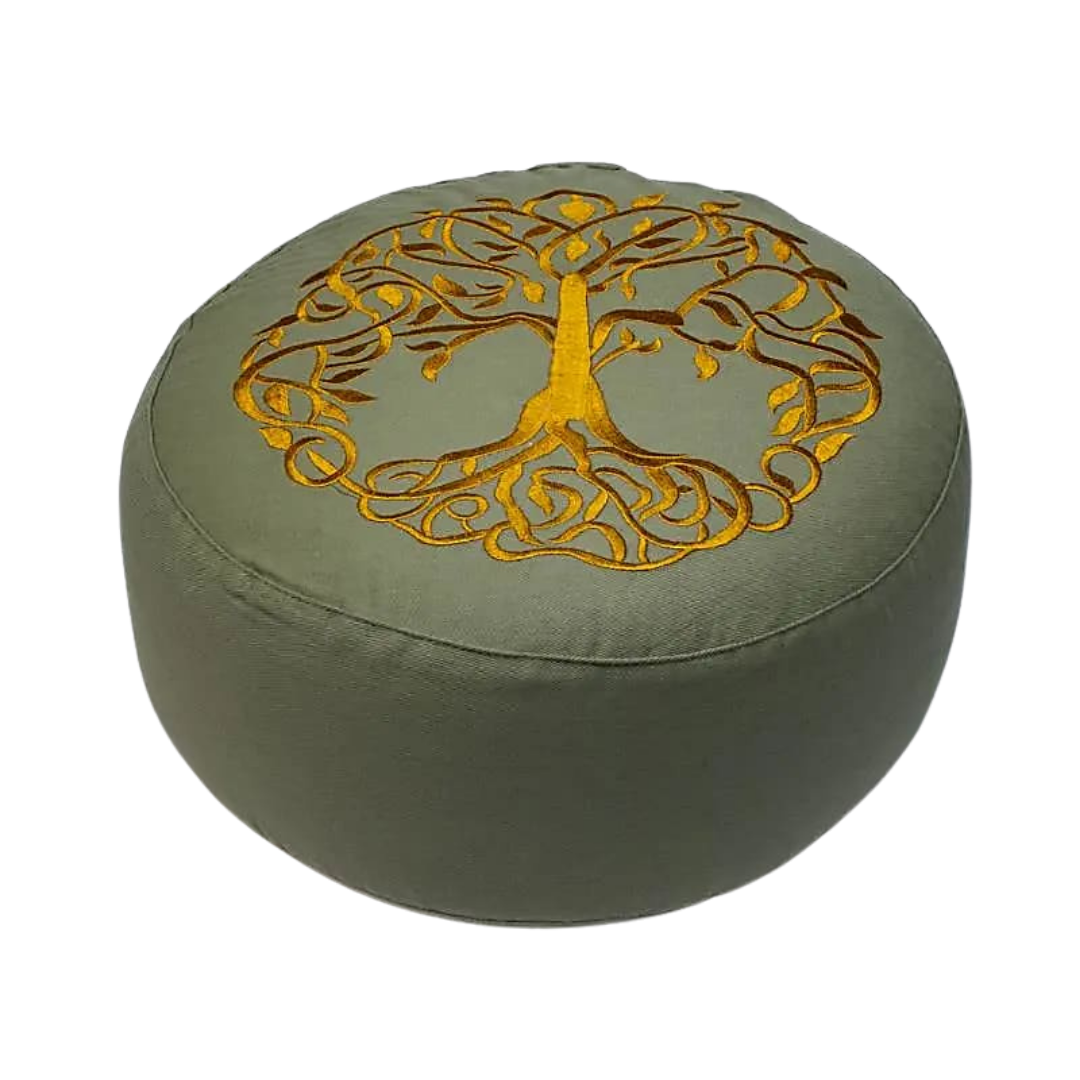 Simbologia: l’Albero della Vita è un simbolo archetipico e universale, presente in molte tradizioni spirituali come rappresentazione della connessione tra cielo, terra e mondo interiore. Le sue radici affondano nella profondità della terra, mentre i rami si estendono verso l’alto, simboleggiando il legame tra il piano materiale e quello spirituale e il continuo processo di crescita e trasformazione dell’essere umano. Associato alla stabilità, alla saggezza e al ciclo della vita, l’Albero della Vita richiama l’equilibrio tra radicamento e elevazione, tra nutrimento e espansione della coscienza. La pula di grano saraceno, materiale naturale e vivo, rafforza questo simbolismo di armonia e adattabilità, offrendo un sostegno solido ma flessibile, capace di accompagnare il corpo e il respiro in una postura stabile e consapevole.