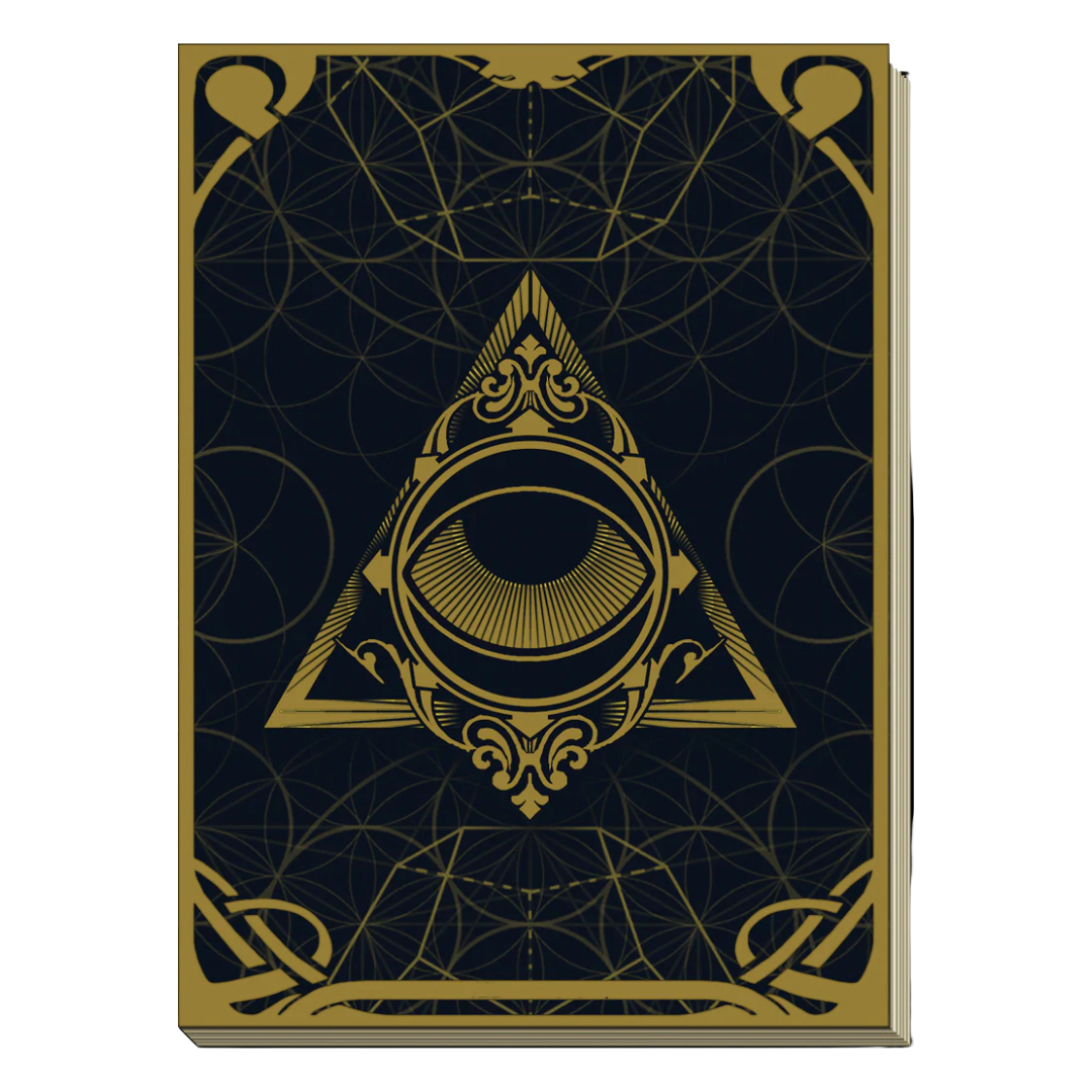 Simbologia: L’occhio centrale inscritto nel triangolo richiama il simbolo dell’Occhio della Coscienza o Occhio della Provvidenza, emblema di visione interiore, vigilanza spirituale e conoscenza oltre l’apparenza. Il triangolo rappresenta la triade sacra – mente, corpo e spirito – e l’equilibrio tra le dimensioni dell’essere, mentre le geometrie di sfondo evocano la struttura armonica dell’universo secondo i principi della geometria sacra. Il contrasto tra il blu notte e l’oro simboleggia l’incontro tra mistero e illuminazione, tra inconscio e rivelazione, trasformando il diario in uno spazio simbolico di esplorazione interiore e consapevolezza spirituale.