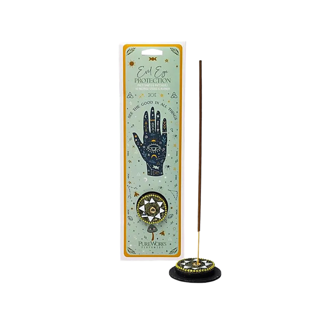 L’incenso Pure Works Protezione dal Malocchio sprigiona una fragranza intensa e avvolgente al Palo Santo e patchouli, simbolo di protezione e purificazione.