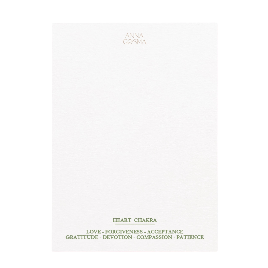Simbologia: il chakra del Cuore, Anahata, è legato all’elemento Aria e rappresenta amore, compassione e armonia nelle relazioni. Nelle tradizioni yogiche è il centro dell’equilibrio emotivo e della capacità di donare e ricevere affetto in modo autentico. Il suo colore verde richiama guarigione, apertura e connessione profonda con sé e con gli altri.