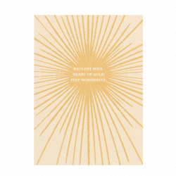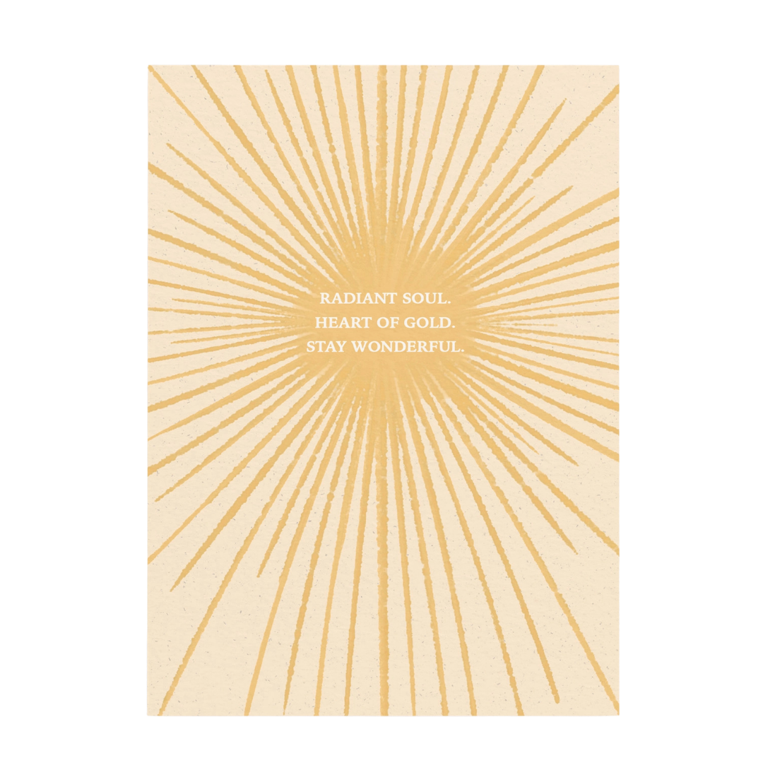 Questa postcard, con il messaggio “Radiant soul. Heart of gold. Stay wonderful.”, celebra la bellezza luminosa dell’anima e invita a restare fedeli alla propria gentilezza, ricordando il valore unico e prezioso della propria luce interiore.