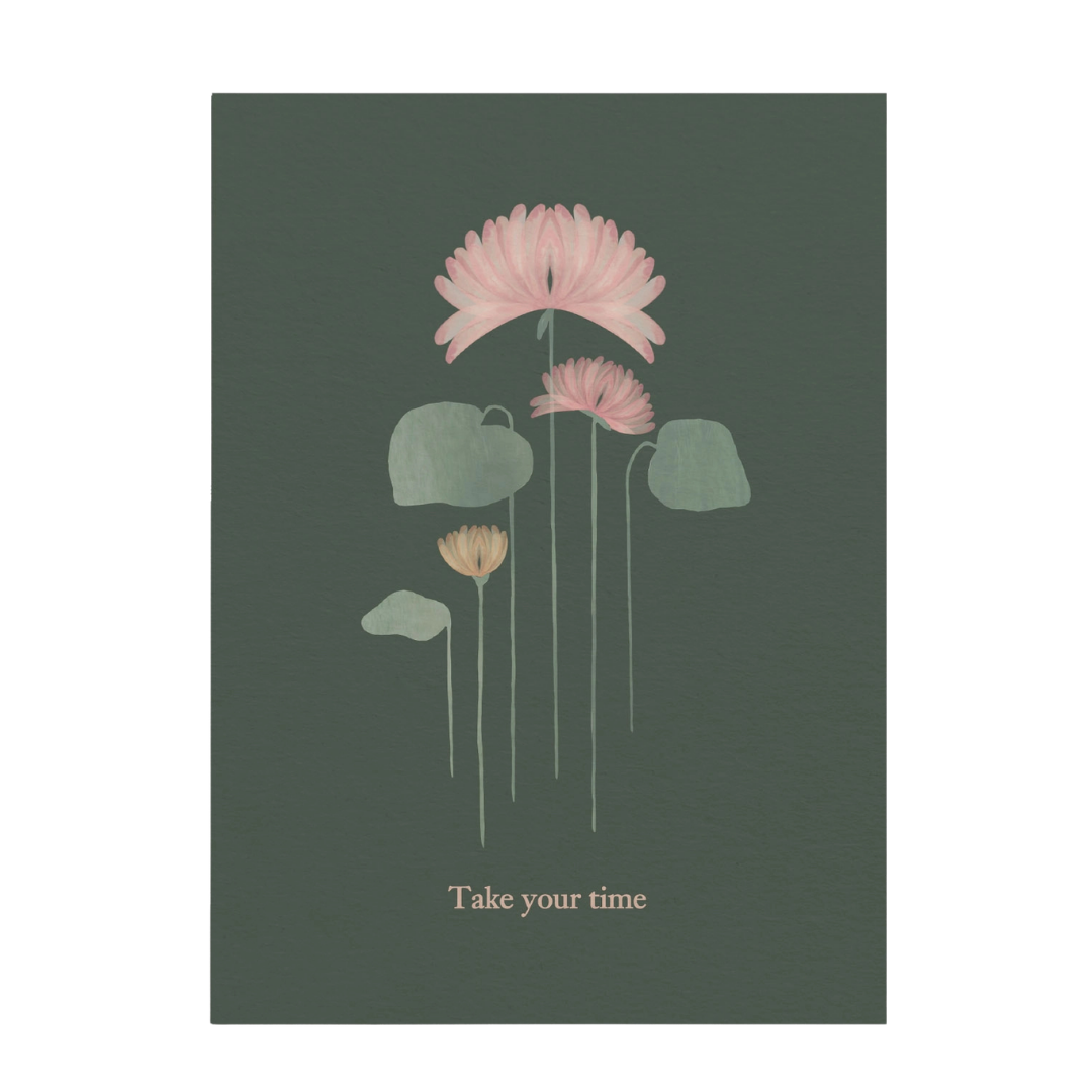 Questa postcard, con il messaggio “Take your time”, invita a rallentare e a rispettare i propri tempi, ricordando che la crescita più autentica avviene con gradualità, cura e presenza.
