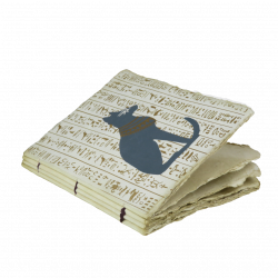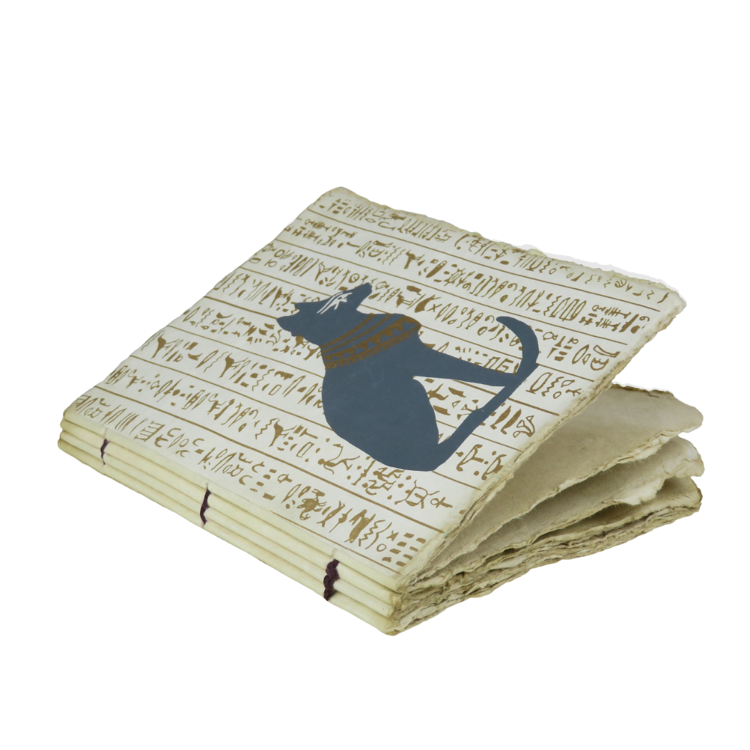 Quaderno Bastet con copertina in carta pergamena decorata da geroglifici e silhouette sacra della dea felina dell’antico Egitto.