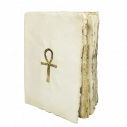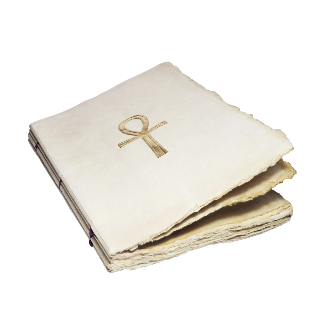 Quaderno Croce di Ankh oro con copertina in carta pergamena naturale decorata dal simbolo sacro della vita eterna dell’antico Egitto.