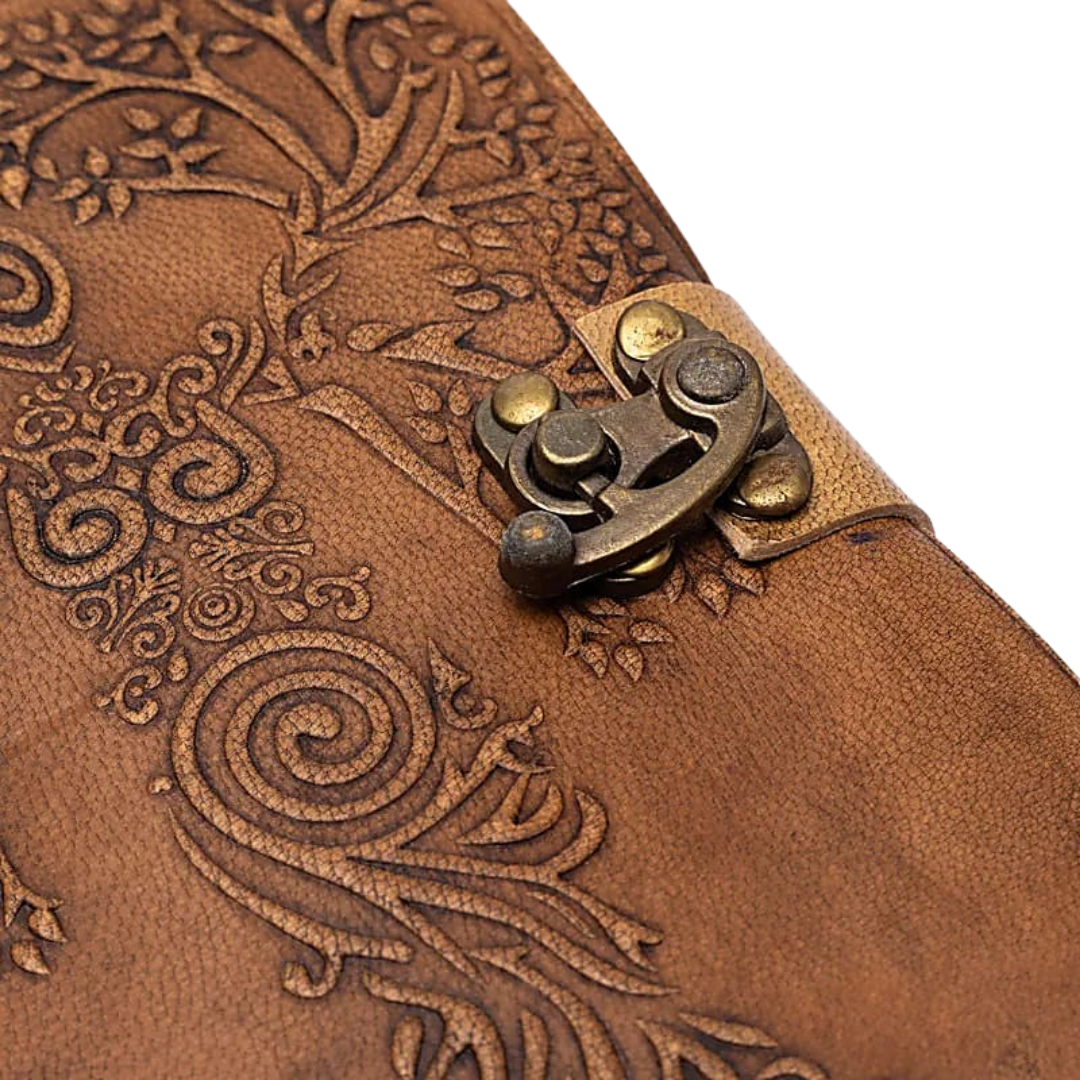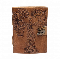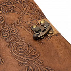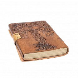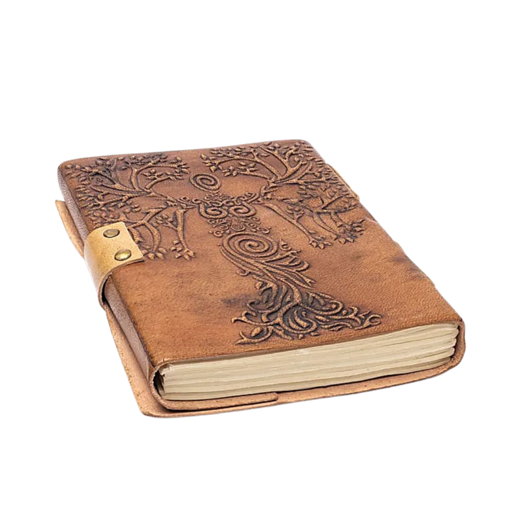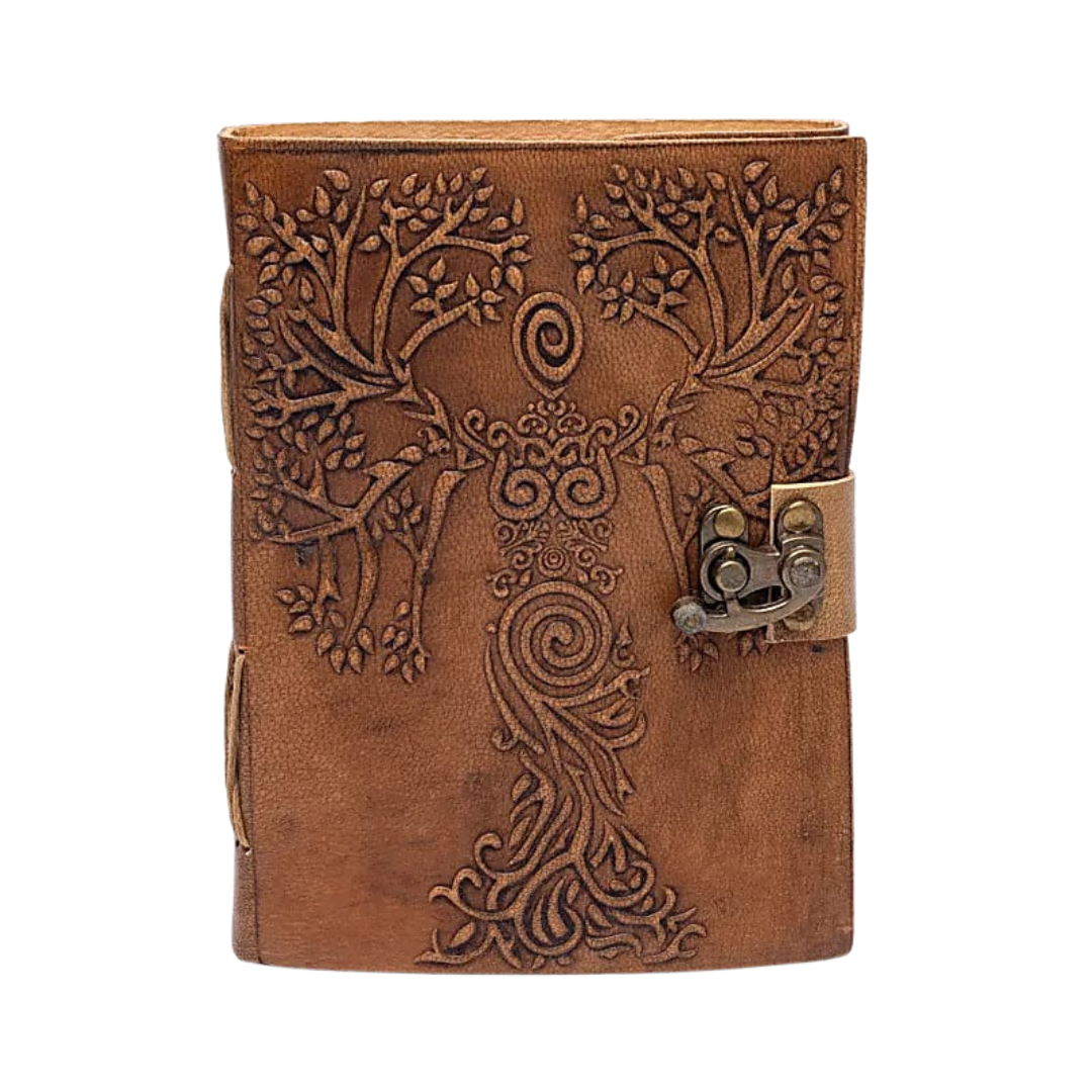 Quaderno Dea e Albero della Vita con copertina in similpelle marrone decorata in rilievo e chiusura metallica dal fascino antico.