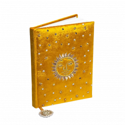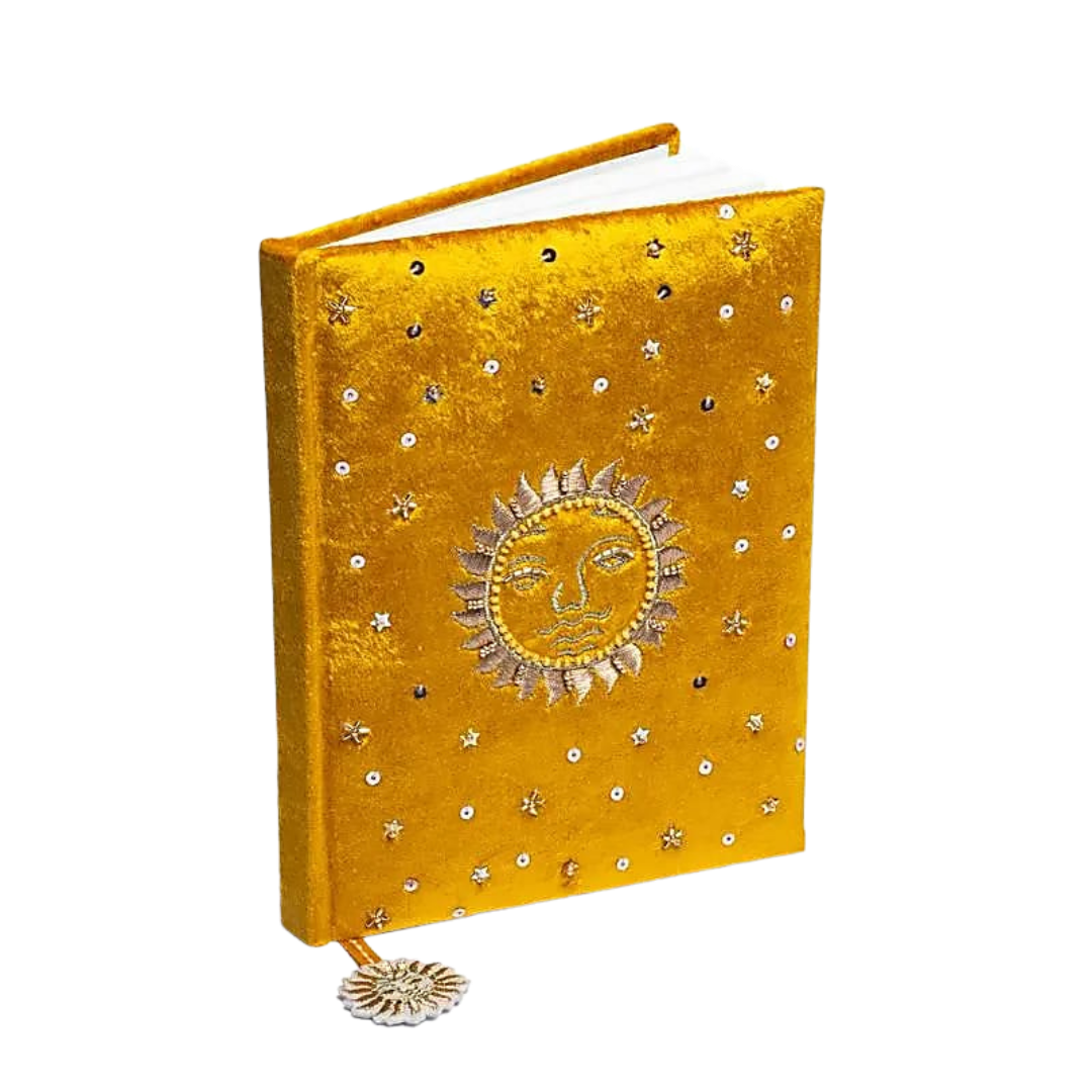 Quaderno in velluto color ocra con sole centrale ricamato e dettagli luminosi, dal carattere caldo e radiante.