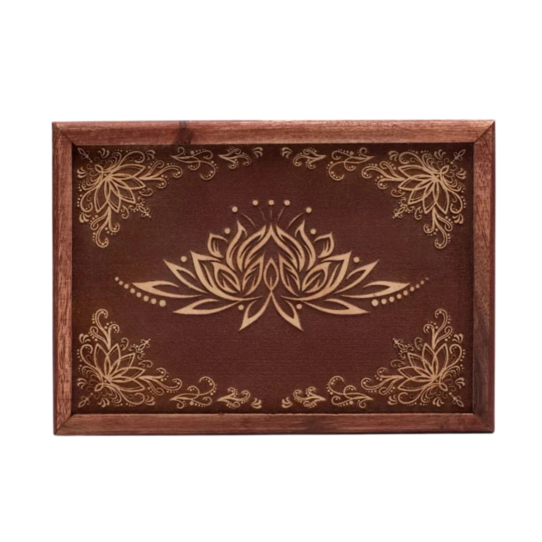 La scatola Fiore di loto unisce funzionalità e profondità simbolica: il legno naturale trasmette calore e radicamento, mentre l’incisione richiama la struttura invisibile che sostiene ogni percorso spirituale. Aprirla e richiuderla diventa un gesto rituale, un confine sacro tra il mondo ordinario e lo spazio della lettura e dell’intuizione.