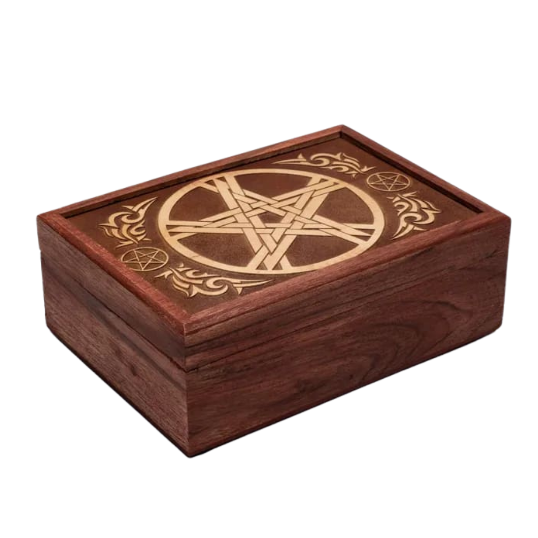 Cofanetto in legno naturale, decorato con il simbolo di un pentacolo inciso. Ideale per custodire mazzi di tarocchi, oracoli o oggetti rituali, protegge e conserva strumenti divinatori mantenendone l’energia raccolta e ordinata. Realizzato con cura artigianale e materiali di qualità.