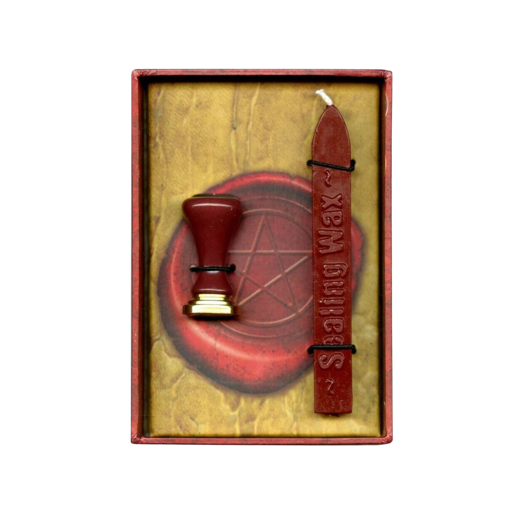Set composto da timbro per ceralacca con simbolo del pentacolo e stick di cera rossa coordinato, pensato per creare sigilli decorativi e simbolici su lettere, pergamene e creazioni artigianali. Il segno esoterico e il colore intenso trasformano la sigillatura in un gesto rituale che unisce forza, tradizione e intenzione. Realizzato con cura e materiali di qualità.