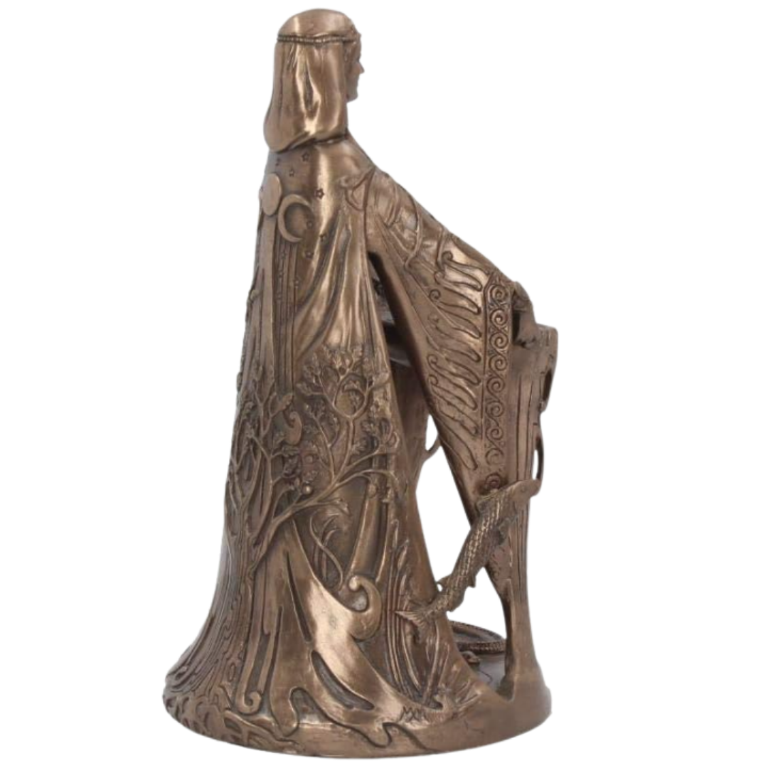 Statua decorativa raffigurante Danu, antica dea celtica primordiale, madre degli dèi e origine della vita, rappresentata accanto a un albero rigoglioso mentre culla un bambino tra le braccia. Figura intensa e archetipica, richiama la maternità cosmica, la fertilità e il legame profondo tra terra, natura e stirpe divina, risultando ideale per altari, spazi rituali o ambientazioni esoteriche. Realizzato con cura artigianale e materiali di qualità.