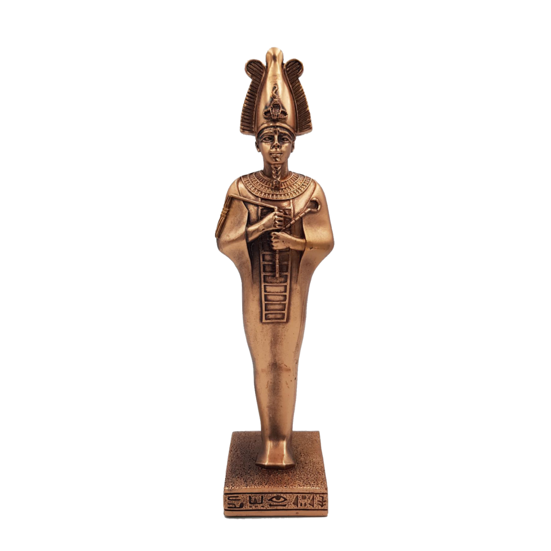 Simbologia: Osiride è una delle divinità centrali della religione egizia e rappresenta il principio della morte rigenerativa e della rinascita. Re divino ucciso dal fratello Seth e ricomposto da Iside, Osiride diviene sovrano del Duat e giudice delle anime, garante della giustizia cosmica e del rinnovamento ciclico. È a lui che i defunti si identificano per rinascere nell’aldilà, come attestano i Testi delle Piramidi e dei Sarcofagi. La postura mummiforme, il flagello e lo scettro richiamano l’autorità regale e la stabilità dell’ordine di Maat, mentre il colore del metallo evoca la fertilità della terra nera del Nilo, da cui la vita rinasce dopo l’inondazione. In chiave esoterica, Osiride incarna il percorso iniziatico della morte simbolica dell’ego e della rinascita della coscienza, modello del passaggio consapevole che conduce alla continuità spirituale.