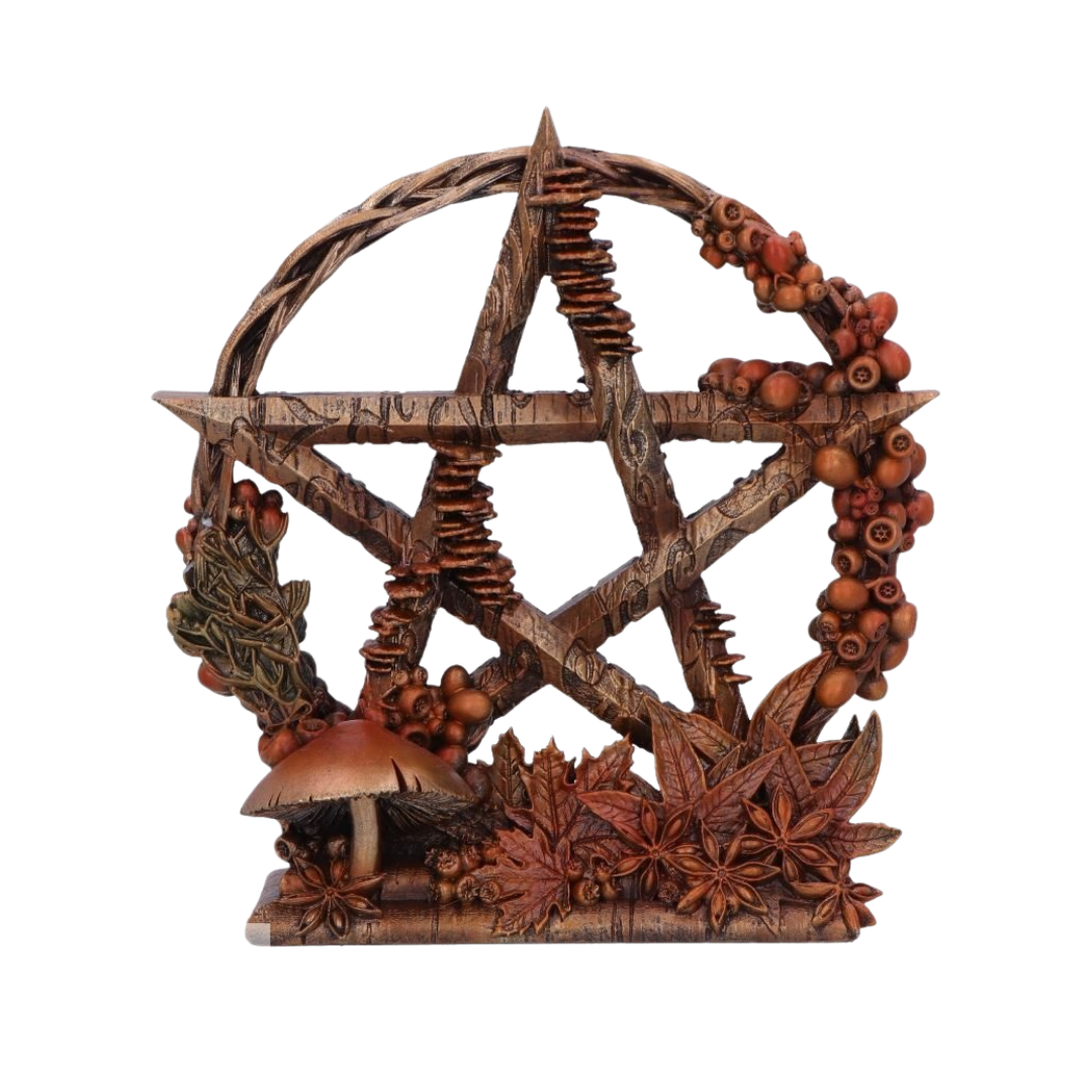 Simbologia: Mabon affonda le sue radici nei culti agricoli precristiani dell’Europa antica, celebrando il secondo raccolto e il ringraziamento alla Terra per i suoi doni. Nella Ruota dell’Anno segna un momento di bilanciamento e introspezione, in cui si onora ciò che è stato seminato e raccolto, preparando spirito e corpo al riposo invernale. Il pentagramma, simbolo dell’armonia tra i cinque elementi, è qui arricchito da elementi autunnali che richiamano la maturità, il sacrificio consapevole e il ciclo naturale del lasciar andare, concetti centrali nella pratica rituale di questo Sabbat.