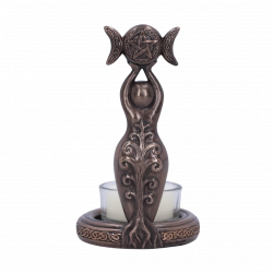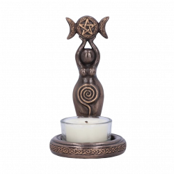Simbologia: la Triplice Dea è uno dei simboli centrali della tradizione wiccan e neopagana e rappresenta le tre fasi dell’esistenza e della luna: Fanciulla, Madre e Anziana, legate rispettivamente alla luna crescente, piena e calante. Questo archetipo affonda le sue radici nei culti precristiani europei dedicati alle grandi dee lunari e terrestri, custodi della nascita, della crescita, della trasformazione e del passaggio finale. Il simbolo lunare tripartito che sovrasta la figura richiama il ciclo eterno del tempo e dell’energia, mentre il pentacolo centrale rappresenta l’armonia tra gli elementi e la protezione rituale. La presenza del portacandela in cima trasforma la fiamma in un’estensione simbolica della luce lunare e della conoscenza interiore, rendendo l’oggetto non solo decorativo ma profondamente operativo sul piano energetico.