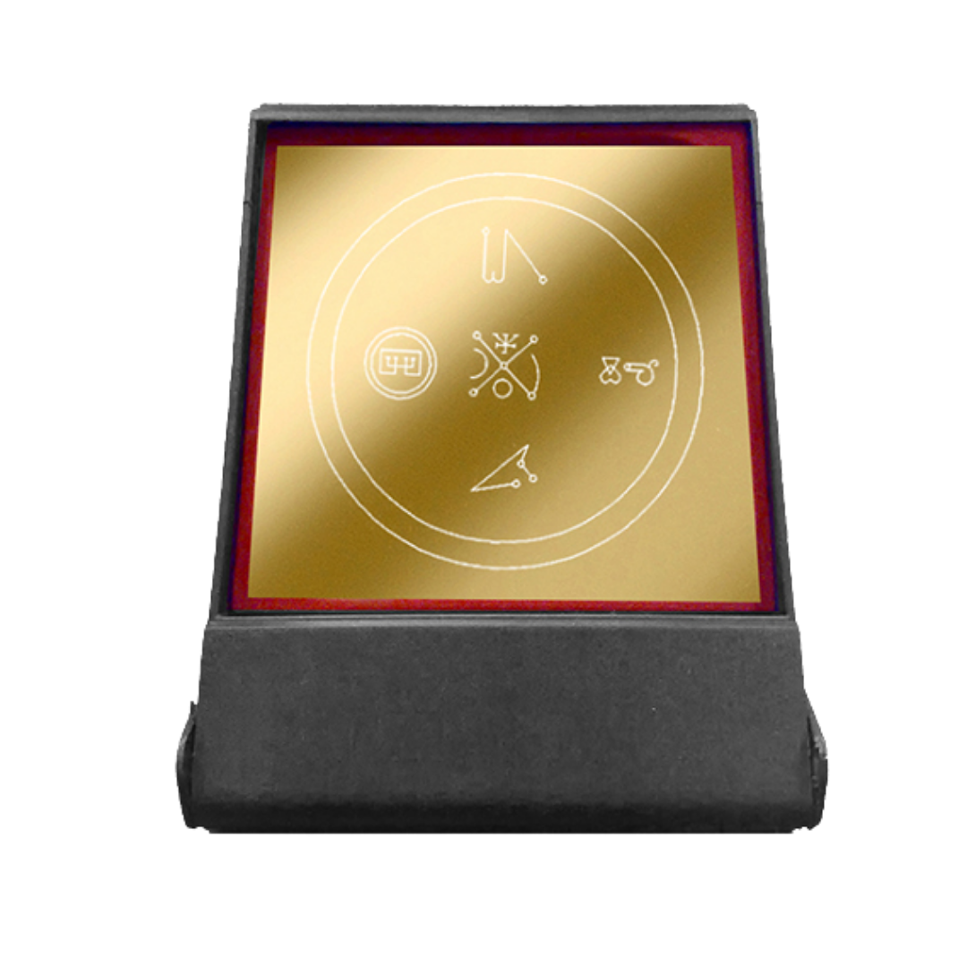 Talismano dedicato all’Arcangelo Anael, inciso su piastra di alluminio dorato secondo la tradizione dei sigilli angelici salomonici.