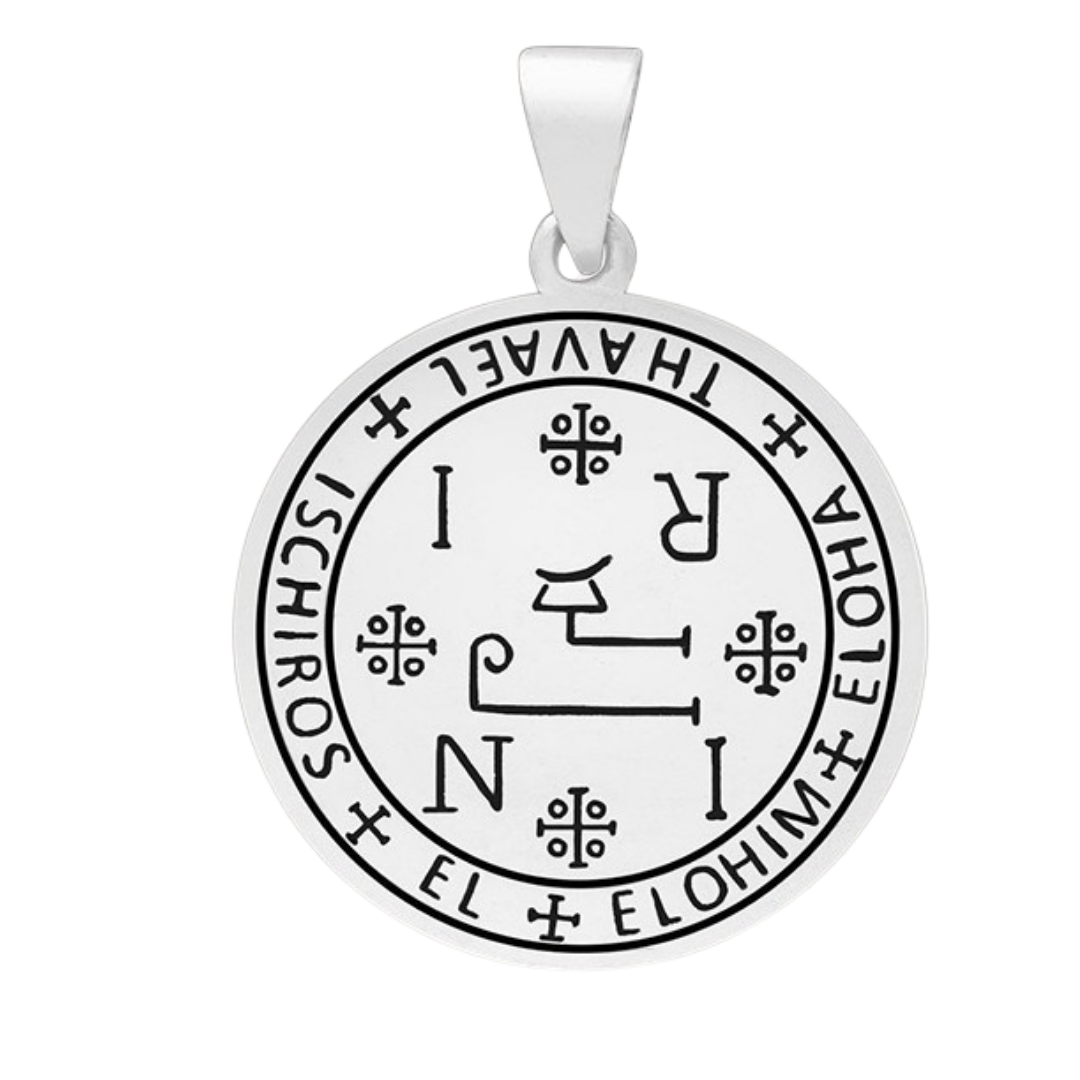 Talismano rotondo dedicato all’Arcangelo Thavael, inciso in argento 925 secondo la tradizione dei sigilli angelici salomonici.