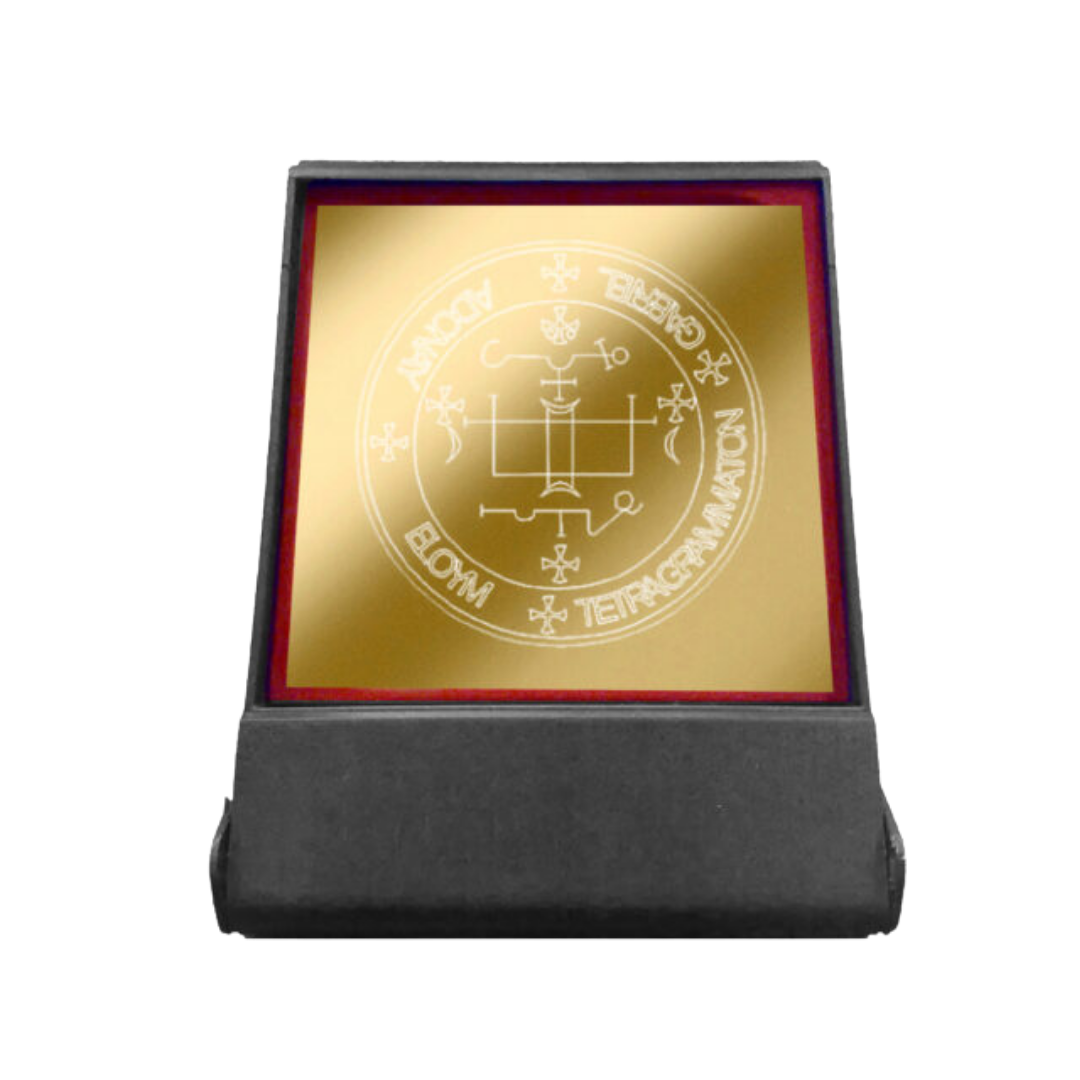 Talismano rotondo dedicato all’Arcangelo Gabriele, inciso su piastra di alluminio dorato secondo la tradizione dei sigilli angelici salomonici.