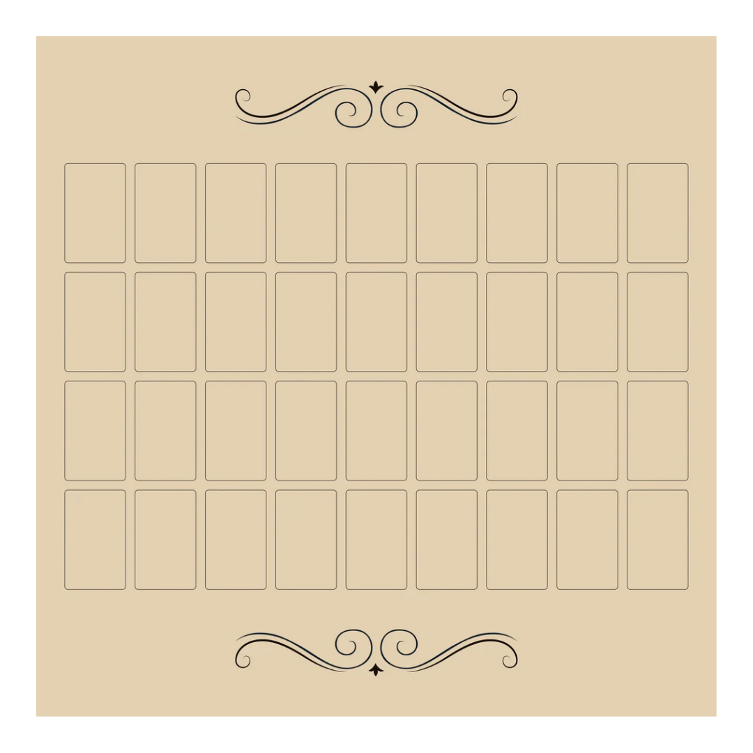 Questo tappetino Grand Tableau è perfetto per studiosi e praticanti del Lenormand che vogliono lavorare con la stesa integrale in modo ordinato e consapevole; ideale per trasformare ogni consulto in una visione ampia e dettagliata del percorso personale e degli eventi futuri.