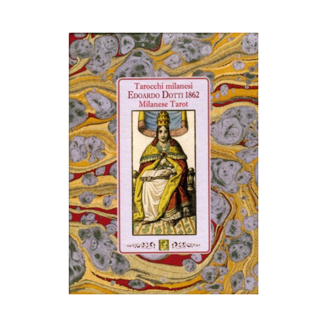 Le carte sono inserite in un elegante sacchetto dorato e, assieme al libretto e al pieghevole, stanno all’interno di un raffinato cofanetto a forma di libro, ideato dall’art designer Letizia Rivetti. Versione a tiratura limitata a 900 copie, assolutamente identica al mazzo originale prodotto intorno al 1860. Osservando le 78 carte dei Tarocchi di Edoardo Dotti emerge subito la straordinaria somiglianza con lo splendido mazzo inciso da Carlo Dellarocca e stampato a Milano intorno al 1835 da Ferdinando Gumppenberg, un fabbricante originario di Monaco di Baviera. Quel mazzo, poi rinominato “Soprafino”, era la rielaborazione di un altro mazzo milanese stampato tra il 1790 e il 1810 da Gentilini e Zoya. Ma la qualità delle figure di Dellarocca è infinitamente maggiore del Gentilini-Zoya. Intorno al 1847 Gumppenberg, ormai anziano, cedette l’attività a suo genero, Lattanzio Lamperti, il quale si dedicò alla produzione di mazzi popolari, sia Tarocchi, sia carte da gioco comuni a semi italiani o francesi. Un altro fabbricante milanese, Teodoro Dotti, che era stato socio di Gumppenberg dal 1838 al 1842, continuò sulla strada intrapresa dal Maestro tedesco e, non avendo a disposizione le lastre di rame usate per stampare il Tarocco “Soprafino”, incaricò un incisore di preparare nuove lastre. Da qui deriva la particolarità del Tarocco di Dotti. Alla morte di Teodoro Dotti, avvenuta verso il 1860, gli successero nominalmente i figli, ma in realtà l’azienda fu tenuta da Edoardo, attivo fino al 1882. Edoardo provvide ad eliminare dallo scudo dell’Imperatrice l’aquila imperiale, simbolo del dominio austro-ungarico su Milano sino all’unità d’Italia, avvenuta nel 1861. Un anno dopo, Edoardo Dotti tolse dall’Asso di Denari il ritratto di un personaggio sconosciuto (forse suo padre Teodoro) per inserire il bollo fiscale imposto dall’amministrazione del Regno d’Italia. Grazie ad un collezionista che possiede la prima versione del Tarocco di Edoardo Dotti, è stato possibile realizzare questa ristampa, assolutamente fedele all’originale.
