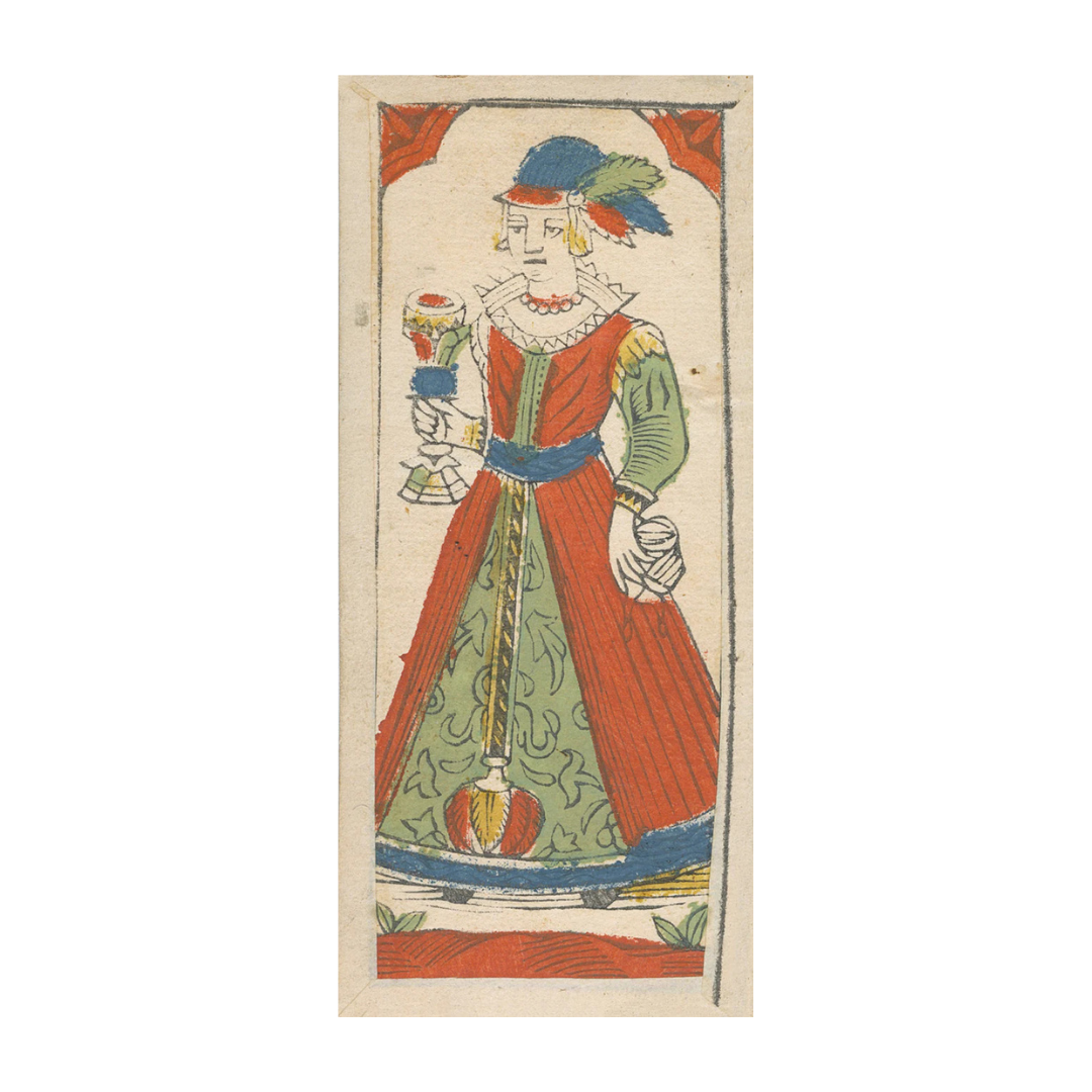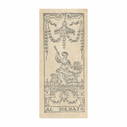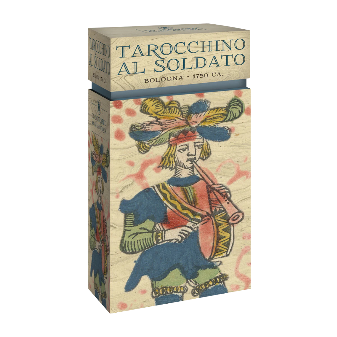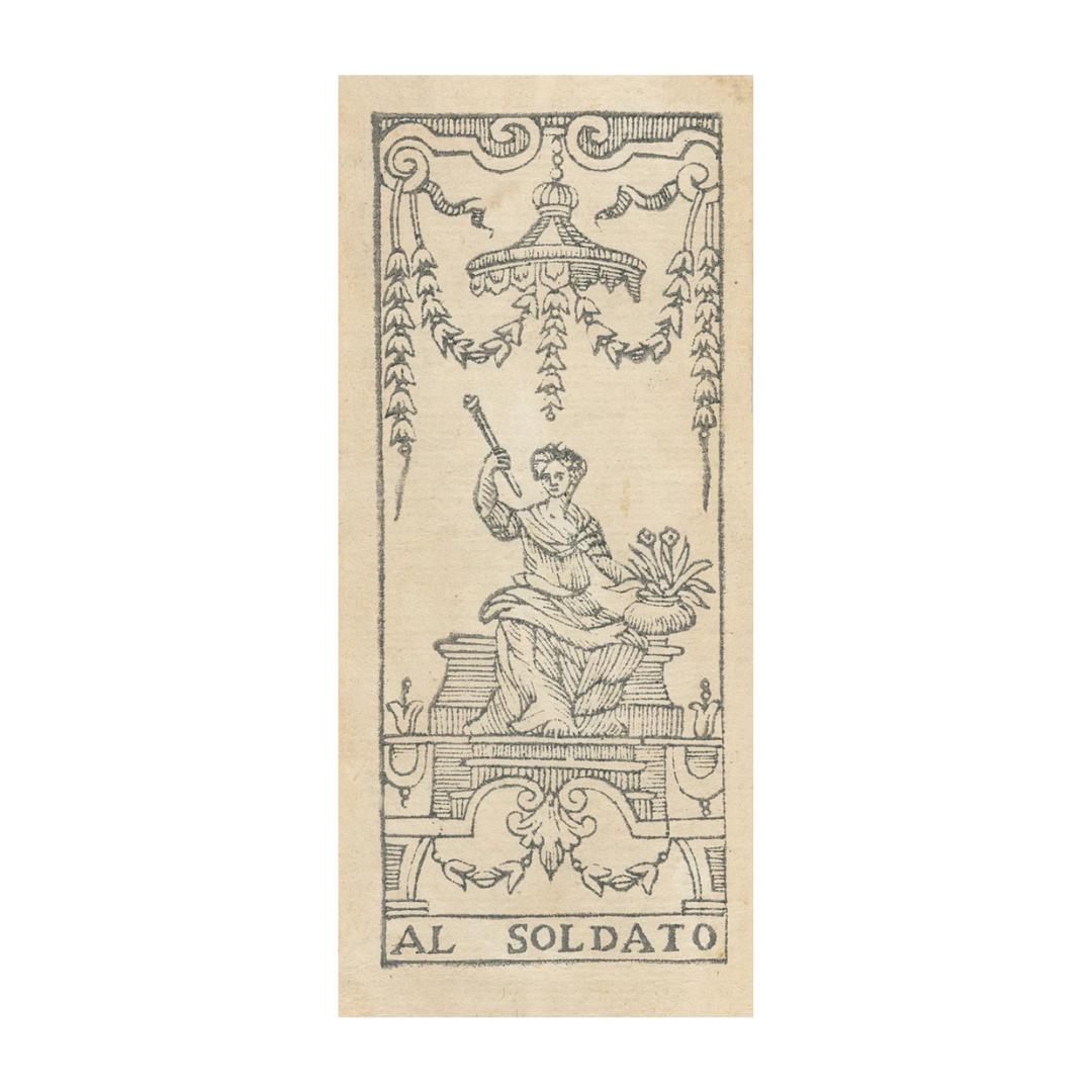 Un mazzo di Tarocchini incredibilmente raro, "Al Soldato" presenta le illustrazioni dei quattro Mori al posto delle carte Gran Sacerdotessa, Imperatrice, Imperatore e Ierofante. Come altri Tarocchini di Bologna, il mazzo è di 62 carte.Bologna, 1750 ca.