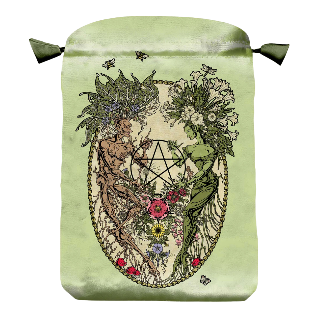 Borsetta per tarocchi in raso ispirata al mazzo The Magickal Botanical Oracle, scritto da Cheralyn Darcey e illustrato da Maxine Miller, decorata con un’illustrazione botanico-esoterica che intreccia figure vegetali e simboli naturali attorno a un pentacolo floreale. Ideale per custodire carte e strumenti divinatori in uno spazio protetto e carico di armonia, trasformando la conservazione in un gesto rituale di radicamento e connessione con le energie della terra. Realizzata con cura e materiali di qualità.