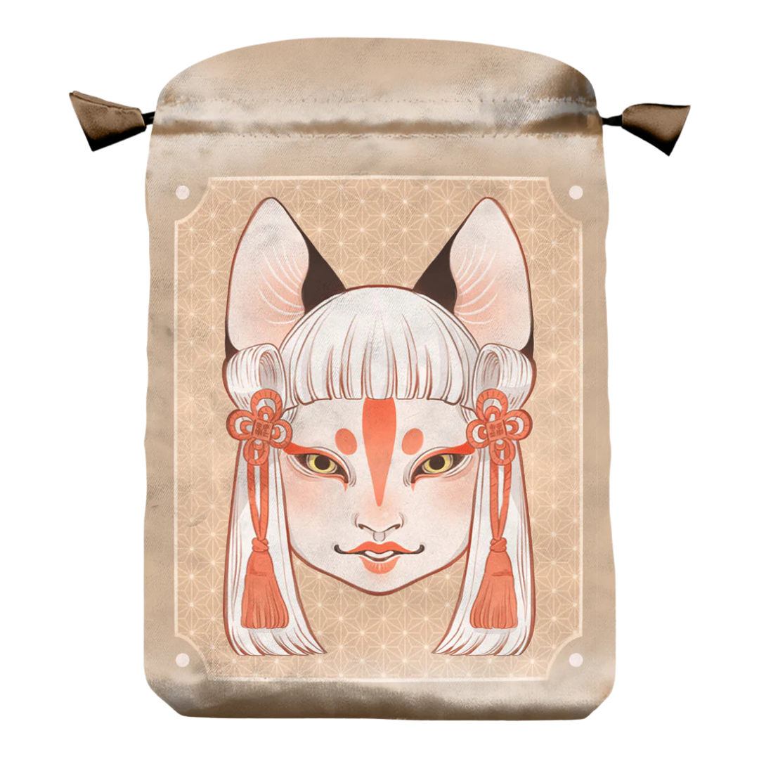 Borsetta per tarocchi in raso color avorio decorata con maschera kitsune, ispirata al mazzo Yokai Tarot illustrato da Marga Biazzi e alla tradizione folklorica giapponese degli spiriti mutaforma. Ideale per custodire carte e oracoli in un’atmosfera elegante e misteriosa, unendo estetica orientale e simbolismo esoterico. Realizzata con cura e materiali di qualità.