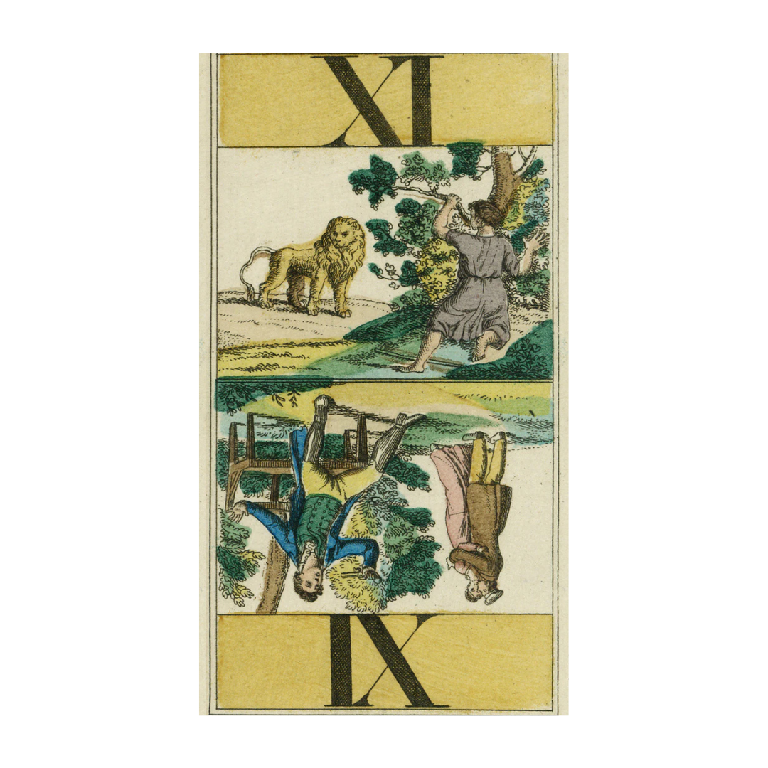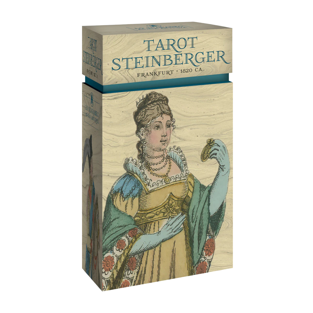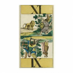 Dalla tradizione tedesca dei Tarocchi, un mazzo di 78 carte illustrato con scene a tema mitologico. Il mazzo veniva stampato utilizzando la tecnica dell’incisione su metallo e poi colorato con pittura tramite mascheratura: un capolavoro del XIX secolo.