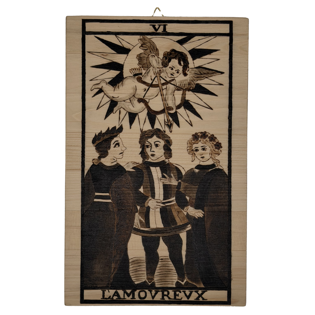 Questa tavola non offre risposte immediate: Gli Amanti incisi a fuoco rendono il legno uno spazio di discernimento, dove la verità emerge solo quando si è pronti ad ascoltarla.