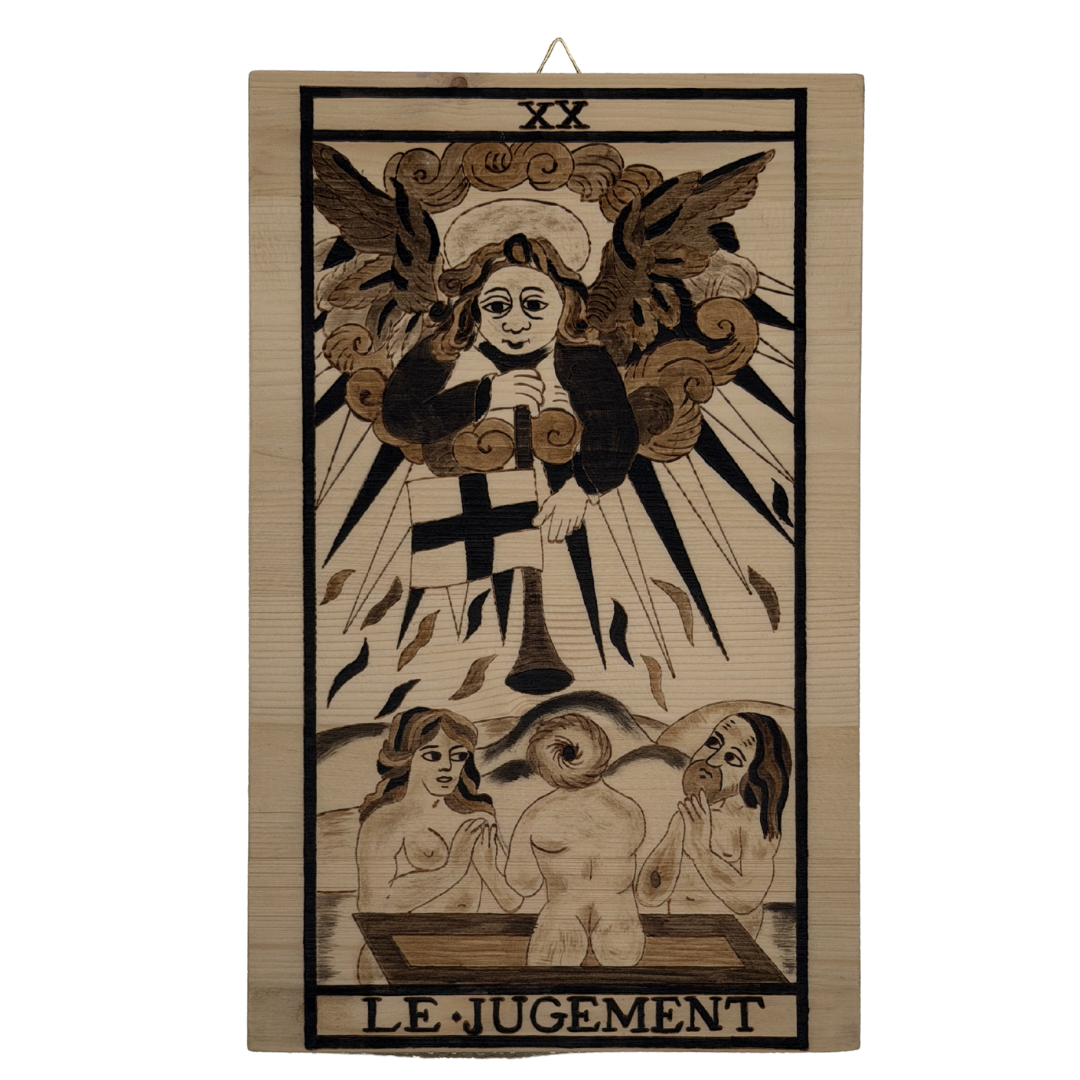 Inciso nel legno, il Giudizio diventa simbolo di risveglio e di integrazione del passato. È legato al perdono, alla riconciliazione con la propria storia e alla capacità di ascoltare la voce profonda che guida verso una nuova fase dell’esistenza. Questo Arcano segna il passaggio dalla ripetizione alla coscienza.