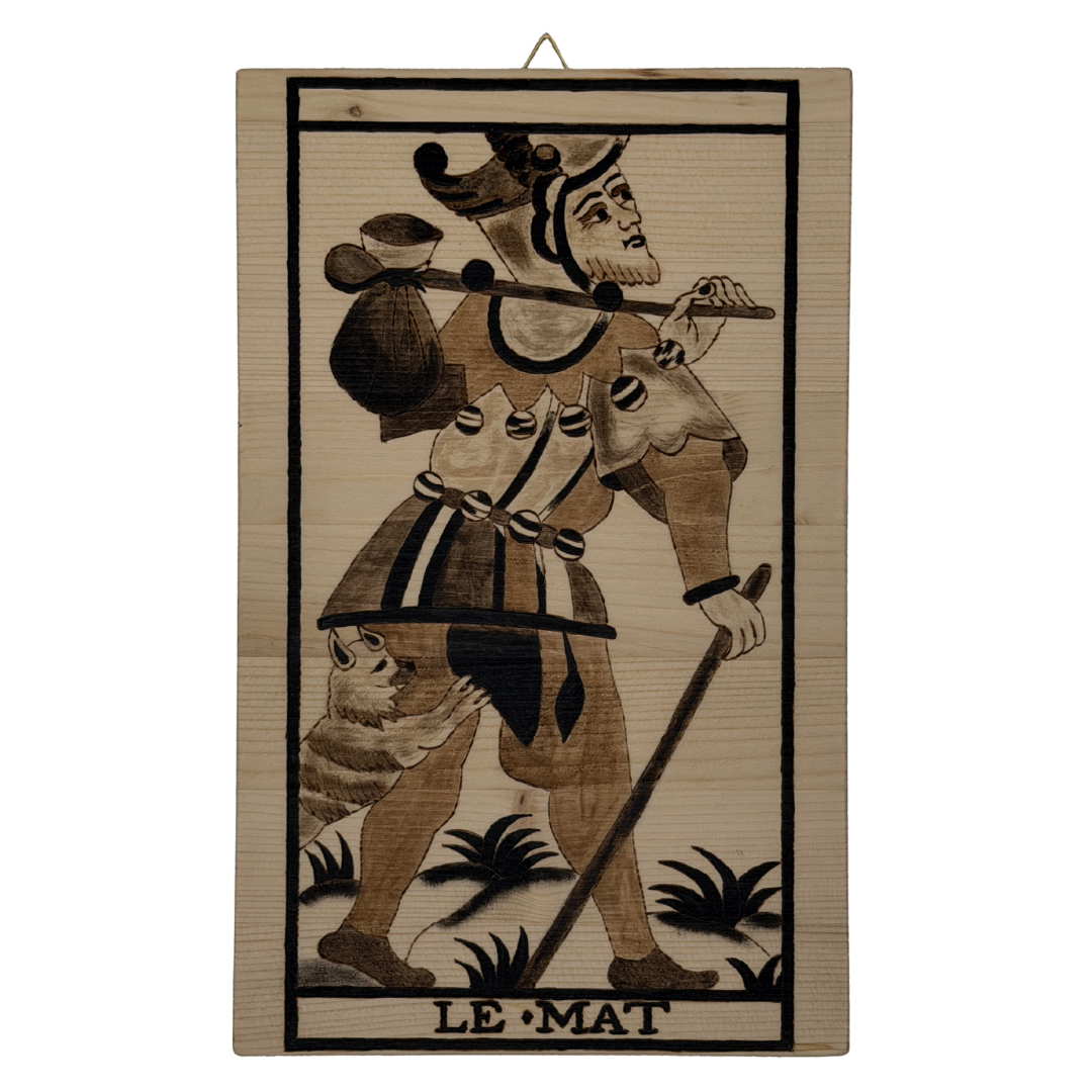 Questa tavola non è solo una rappresentazione, ma un invito: il Matto inciso nel legno accompagna il praticante nel riconoscere il valore del passo nel vuoto come atto sacro di fiducia.