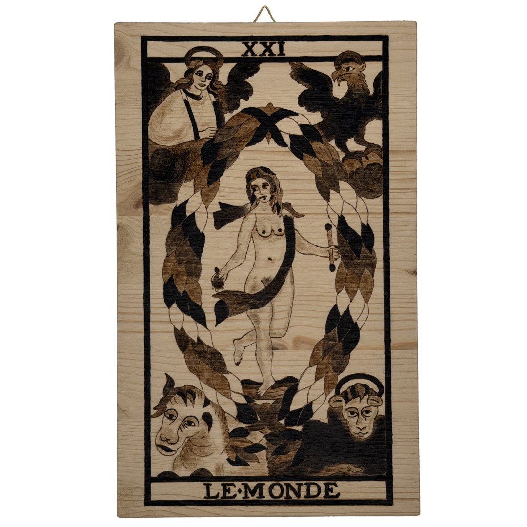 Questa tavola non è solo una conclusione, ma una soglia permanente: Il Mondo inciso a fuoco trasforma il legno in uno spazio di totalità sacra, dove il cammino iniziatico si ricompone in una danza armonica tra tutte le parti dell’essere.