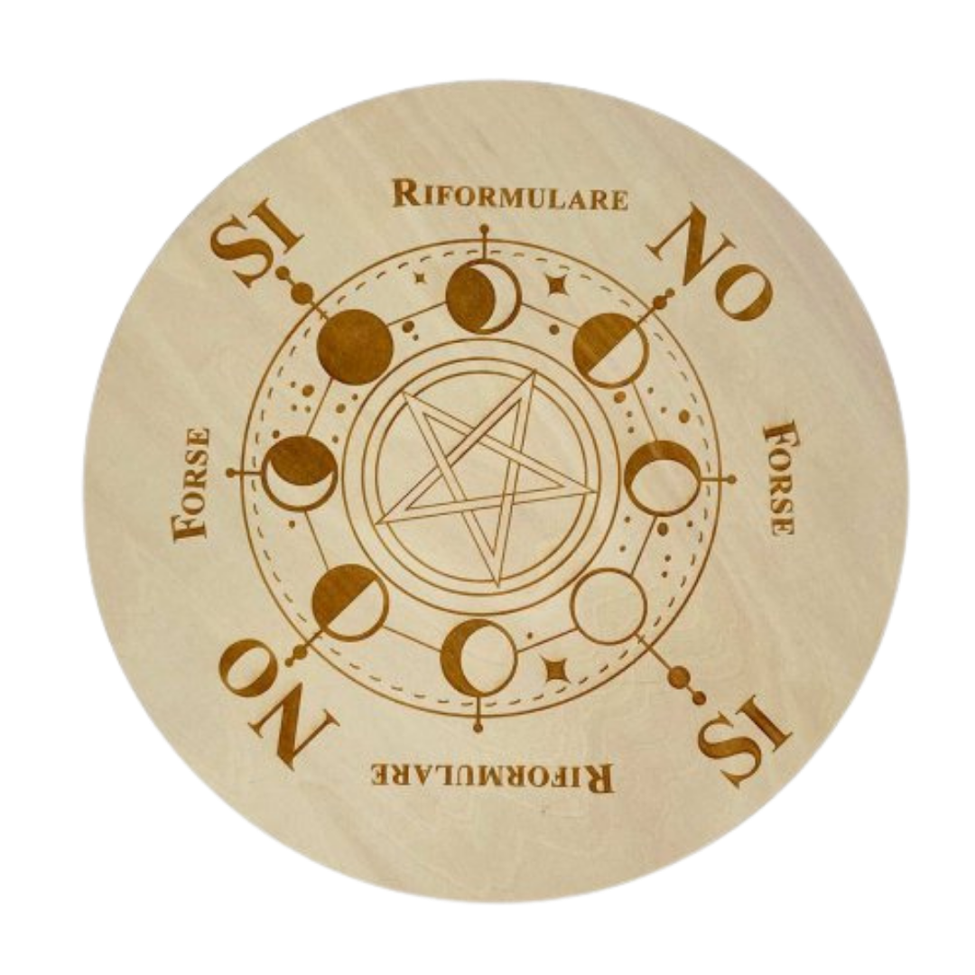 Origine della tavola divinatoria: l’uso di superfici o tavole come strumenti di divinazione ha radici molto antiche. In diverse culture, dall’antica Grecia al Medio Oriente fino all’Europa medievale, simboli, lettere o segni venivano disposti su tavole rituali per facilitare pratiche di consultazione spirituale e interpretazione dei segni. Nel XIX secolo questo tipo di strumento divenne popolare con la nascita della tavola Ouija, probabilmente la più celebre tavola divinatoria, diffusa negli ambienti dello spiritismo per la comunicazione simbolica con il mondo spirituale. Ancora oggi le tavole divinatorie sono utilizzate come supporti simbolici per pratiche intuitive e percorsi di esplorazione spirituale.