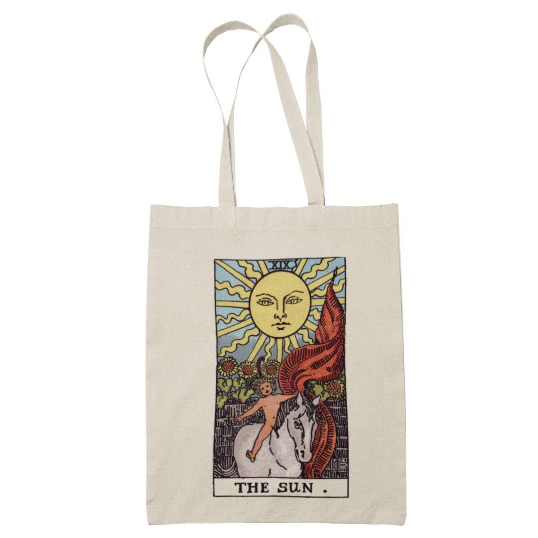 Borsa in cotone resistente con grafica ispirata all’Arcano Maggiore Il Sole del mazzo Rider-Waite-Smith, simbolo di gioia, chiarezza e pienezza dell’energia vitale. Realizzato con cura artigianale e materiali di qualità.