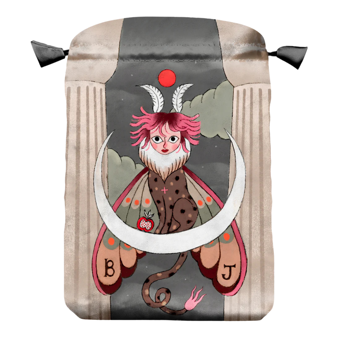 Borsetta in raso stampato ispirata al mazzo Wicked Moon Tarot illustrato da Lunastorta, con una creatura lunare sospesa tra colonne antiche e simboli notturni, evocazione di mistero e metamorfosi. Ideale per custodire il tuo mazzo in uno spazio protetto e carico di fascino oscuro. Realizzata con cura e materiali di qualità.